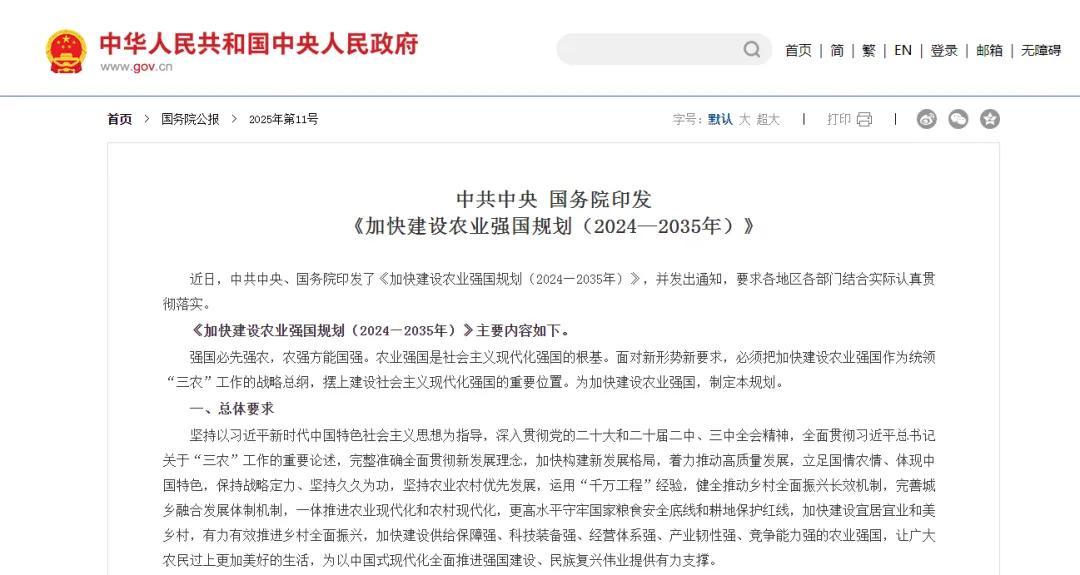 “强国必先强农,农强方能国强”,这一重要论断深刻阐明了农业在国家发展中的基础性地位。《加快建设农业强国规划(2024—2035年)》将粮食安全保障列为头等大事,强调深入实施藏粮于地、藏粮于技战略。2025年中央一号文件同样聚焦农业强国建设,明确提出要健全多层次农业保险体系,为农业现代化筑牢保障根基。