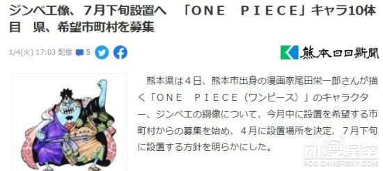 日本熊本县是《海贼王》漫画作者尾田荣一郎的家乡,为了发展相关的旅游业,熊本县之前一直都在设立《海贼王》中草帽一伙的铜像。目前《海贼王》漫画的内容已经到了和之国的关键,草帽团一伙的成员已经确定了第十人——甚平。1月4日,熊本县官方宣布将打造甚平雕像,将于定7月正式放置。