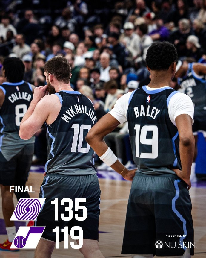 爵士这边,马尔卡宁、小杰克逊、基昂特-乔治、努尔基奇等都没有出战,全队也有6人得分上双。森萨博表现出色,首发出场36分钟,19投8中,三分球11中5,罚球9中7,空砍28分4篮板,正负值-27。