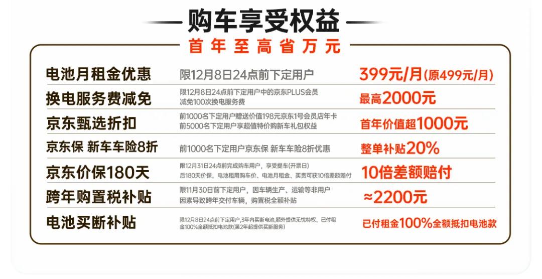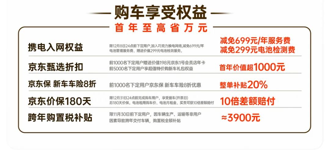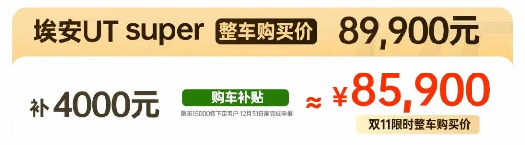 与此同时,埃安UT super在价格与权益上诚意满满。车电分离4.54万元起,整车8.59万元起的价格,现购车可享“返现、增值、价保”三大权益:返现方面,前15000名用户享2000-4000元购车补贴,前1000名PLUS会员再赠2500元京东E卡;增值方面,电池月租限时优惠,截至12月8日24点前选择电池租用购车的用户,电池月租金由499元/月限时降至终身399元/月,此外京东Plus用户赠送100张巧克力免换电服务费券;更有“180天价保”承诺,提车后半年内降价可获10倍差额赔付,早买更划算。