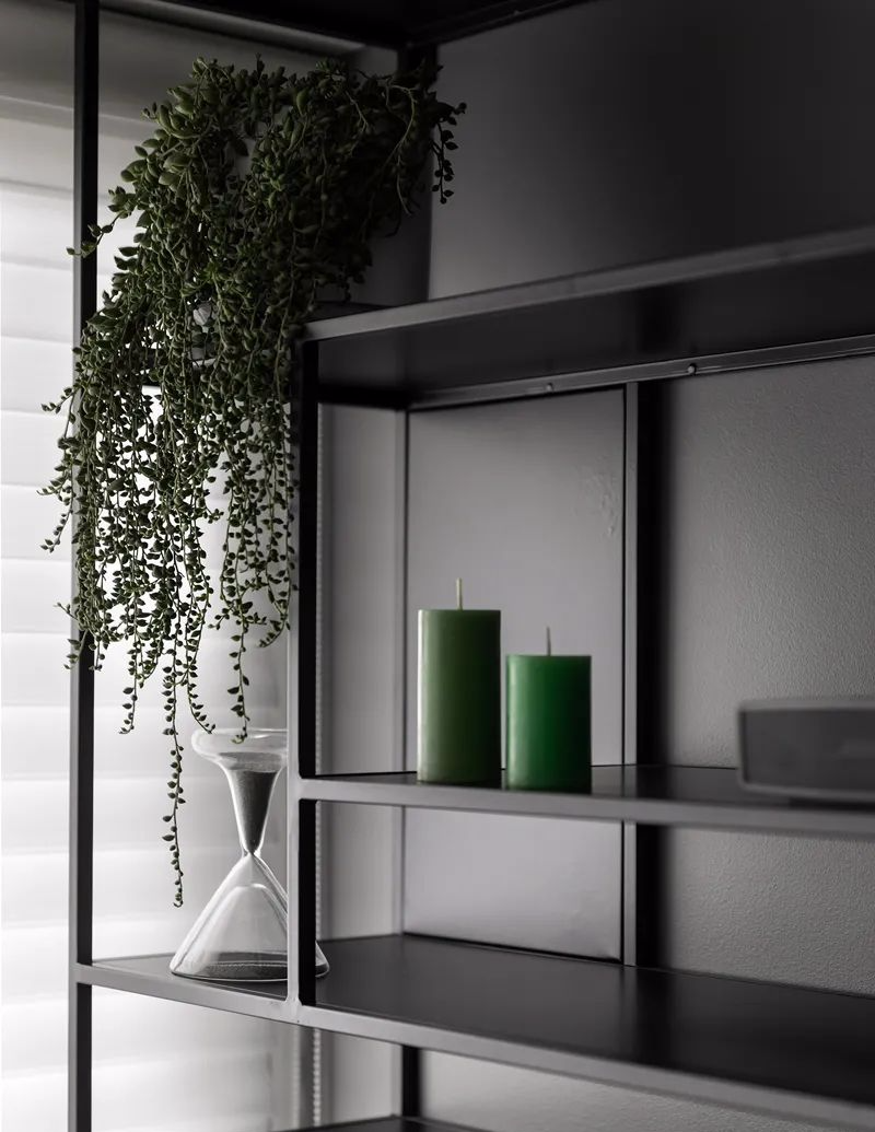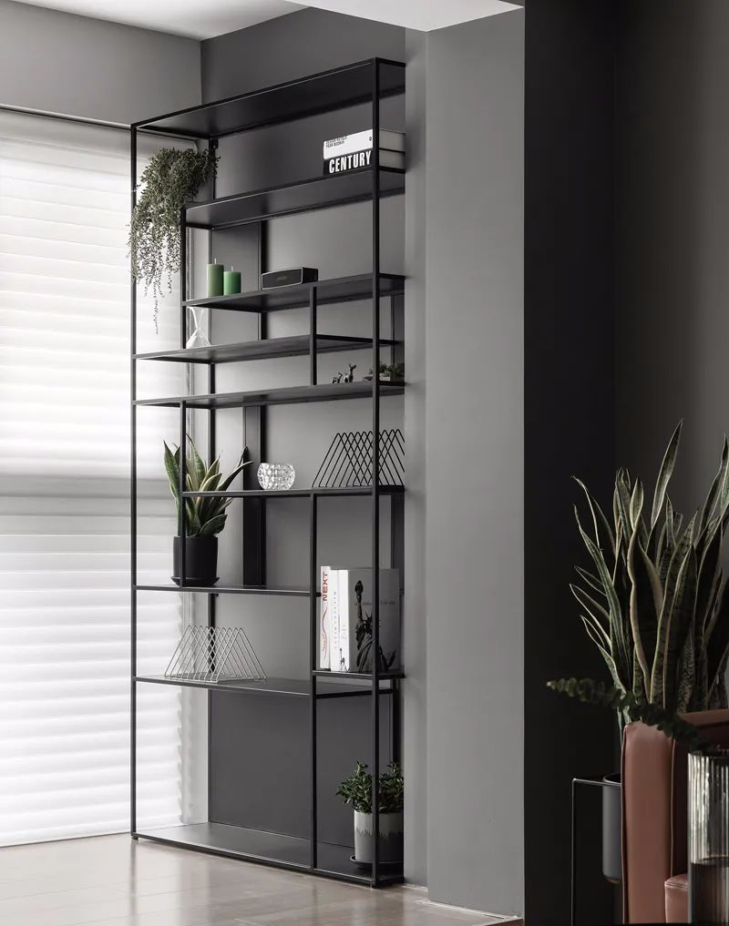 黑色的收纳展示架上,布置花瓶与装饰品,简洁而又高级大气。