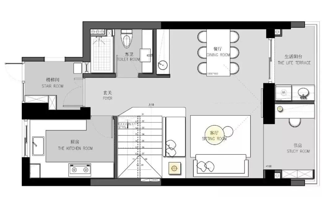 从平面布置图可见,设计师对复式空间的规划重点在 “通透感” 与 “功能整合”:通过打通阳台、优化动线,让上下层空间既独立又连贯,在 135㎡的面积里,兼顾了休闲、用餐、办公、居住等多重需求,不显拥挤。