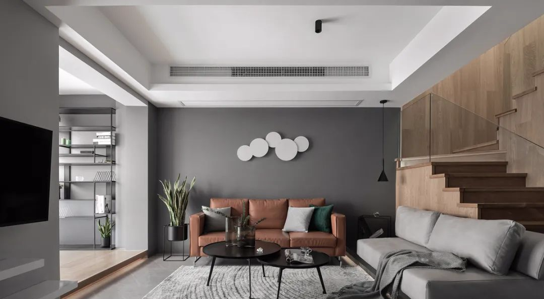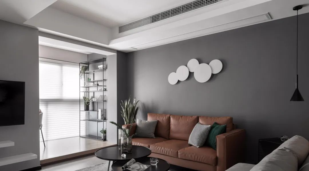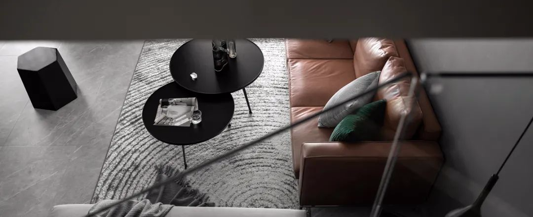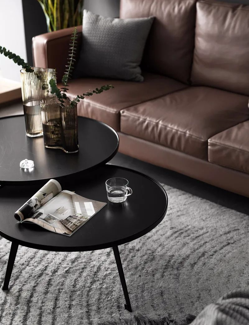 色彩与家具:在全灰空间里,摆两张圆形黑色托盘茶几,配焦糖色皮沙发,再用绿植点缀 —— 黑色的利落、焦糖色的温暖与绿植的生机,中和了灰色的沉静,让空间简约端庄又不失活泼高档;
