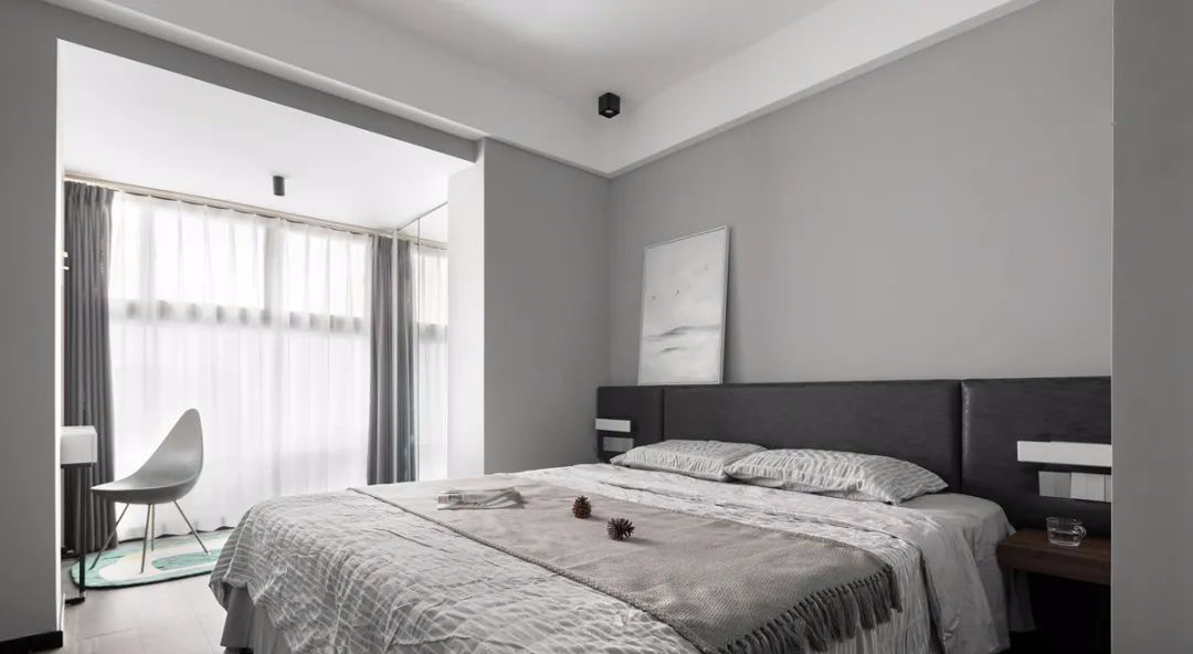 卧室以 “浅灰色” 营造宁静睡眠氛围,细节设计藏巧思: