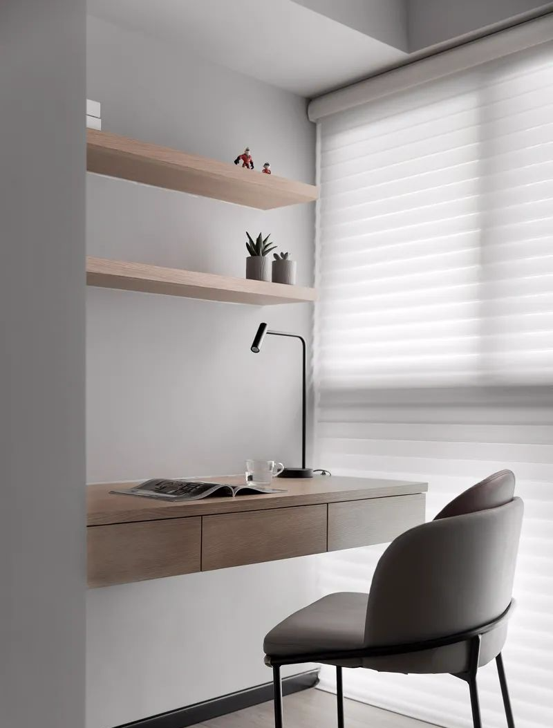 功能布局:一侧放黑色收纳展示架,摆上花瓶与装饰品,简洁又高级大气;另一侧装悬空书桌与展示架,在明亮光线加持下,为主人打造了一个轻松舒适的阅读与工作区,实现 “小空间多功能”。