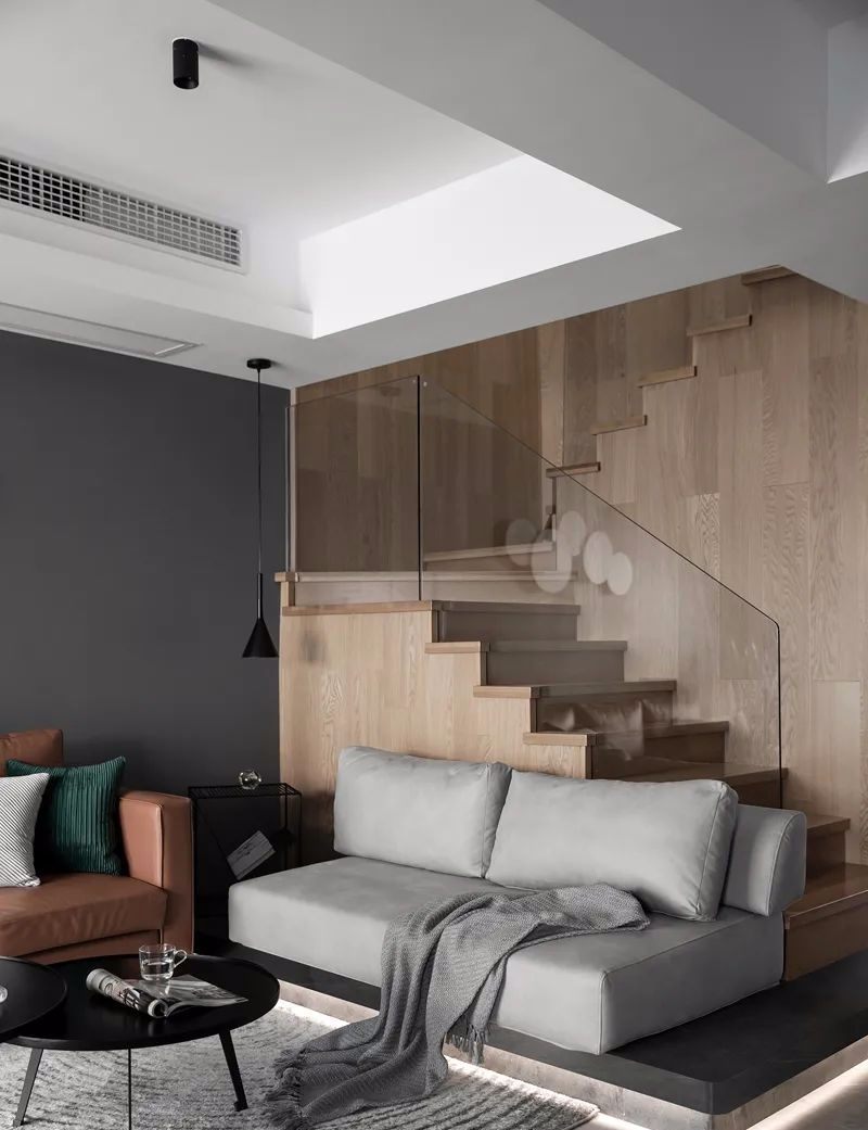 楼梯与装饰:客厅侧边是木质楼梯,搭配墙面护墙板与玻璃扶手,简洁时尚又显高级;空间里还摆放了精致华丽的小饰品,为简约低调的氛围注入独特的现代高级质感。