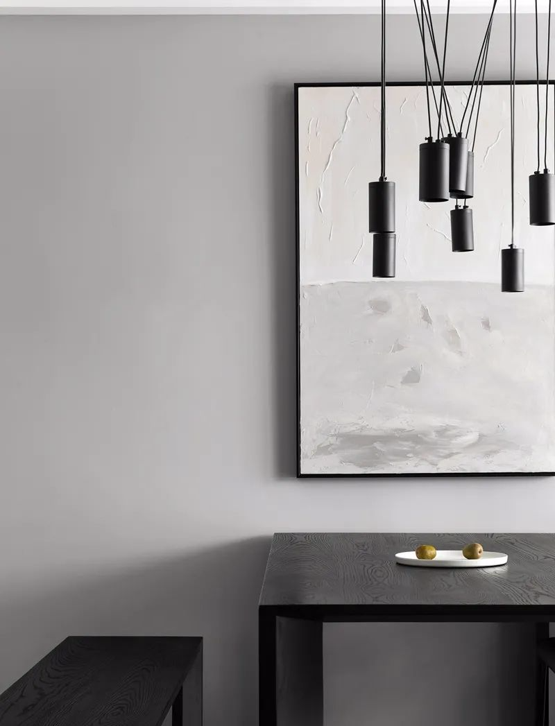 细节与氛围:墙面挂黑白色装饰画,摆几盆小盆栽,为用餐区注入生机;浅灰色墙面上挂着灰白色朦胧抽象装饰画,上方装一盏黑色多头吊灯 —— 柔和的灯光与简约的装饰结合,让餐厅充满精致的仪式感;