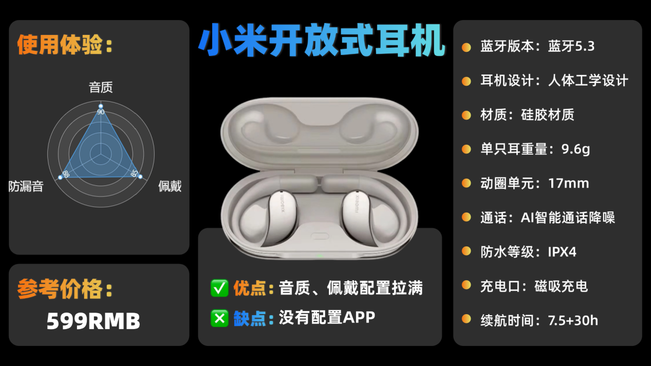 小米开放式耳机真的很轻巧,单只只有9.5g,但时间佩戴基本没什么感觉。耳挂部分用了亲肤液态硅胶,贴合度很好,不管是跑步还是通勤都稳稳的,不会掉。而且长时间戴着也不会压耳朵,眼镜党完全不用担心不舒服。音质方面,它搭载了16.2mm的大尺寸动态单元,加上小米自研的「声学导管增强技术」,低音扎实,人声也清晰透亮。在嘈杂的环境下可能会丢点细节,但日常听歌、追剧是够用的。