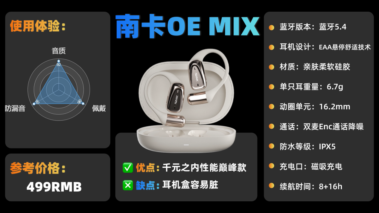 如果挂耳式耳机只能推荐一款的话,那么首先推荐的肯定是南卡的OE MIX!在音质和佩戴体验上都做到了旗舰级别!要说它是开放式耳机卷王真的一点都不过,OE MIX凭借其一己之力重新定义百元旗舰标杆!