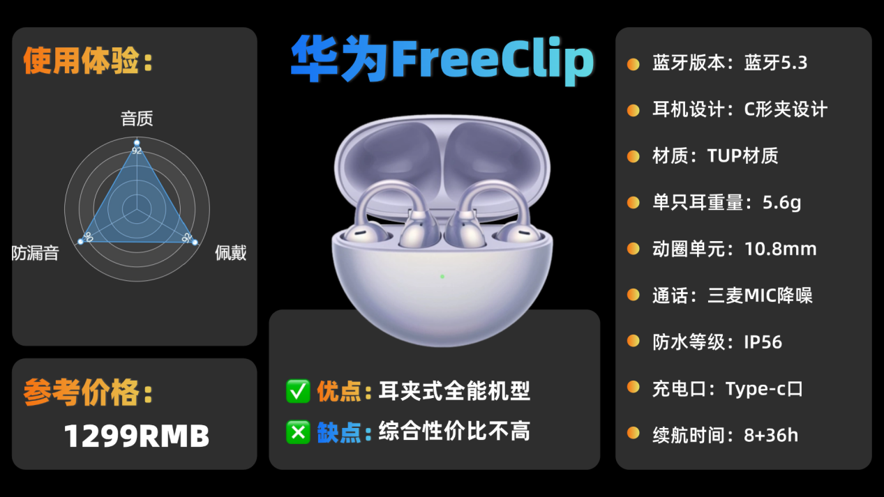 如果你的预算在千元以上,且是华为生态系统,那我建议你一定要试试华为FreeClip!如果你的预算在千元以上,那么这款是我的首推!华为FreeClip耳机的外观设计很有质感,采用磨砂烤漆工艺,在阳光下会有金属光泽,低调又有高级感。整体造型融合了时尚和科技感,受到了不少年轻用户的喜爱。