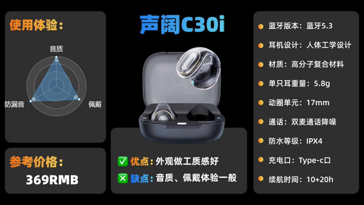 预算两百左右,对舒适度、音质要求高的朋友,强烈建议选择南卡clippro!这款耳机是我实测过的五百内价位开放式耳机中体验非常出色的一款!是我去年一整年使用频率最高的一款开放式耳机。非常牛的是,它两百多的价格音质配置直接拉满,完全能够跟市面上千元级开放式耳机相媲美!