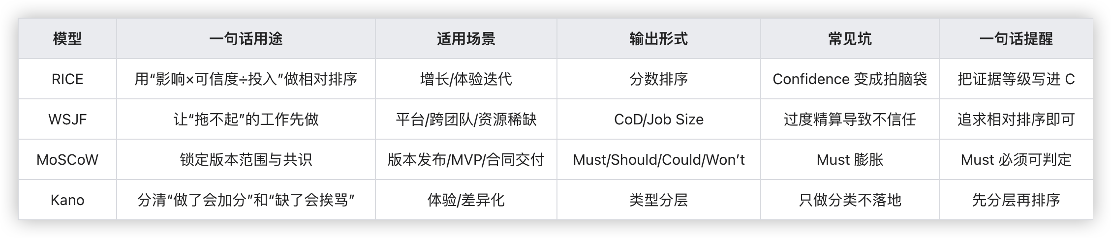 再用 RICE 或 WSJF 在同类里排序,既有方向感又有可执行性。