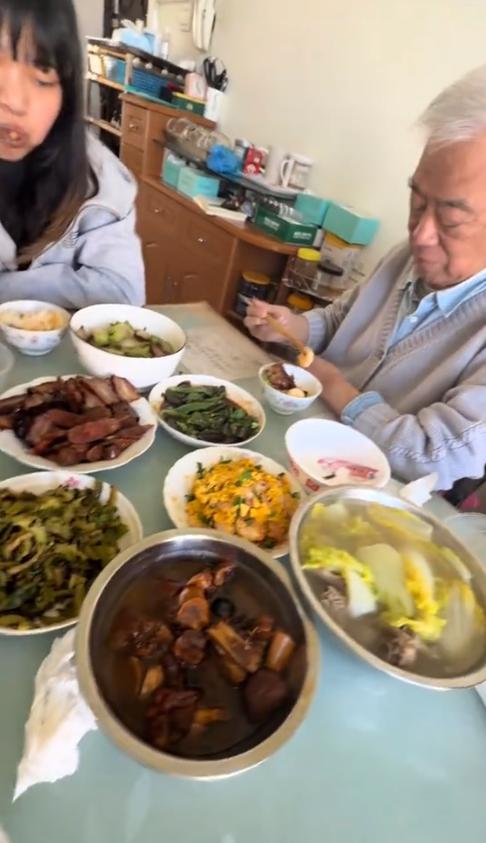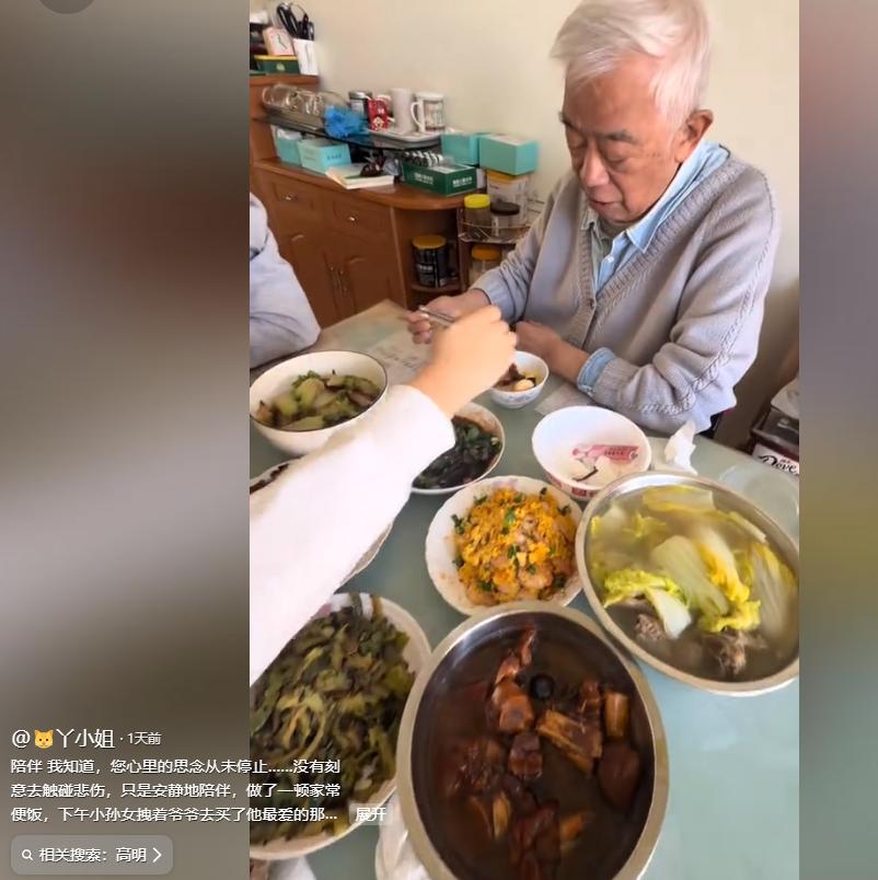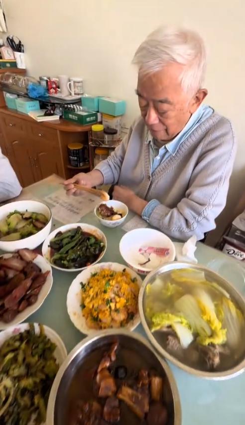 吃饭时,大孙女用筷子夹起最大的一只虾仁,小心翼翼地放进爷爷碗里,嘴里还念叨着 “爷爷多吃点,补补身体”。高明举起虾仁,对着镜头露出了欣慰的笑容,头发虽然全白了,但精神状态很好,眼角的皱纹里都透着暖意。