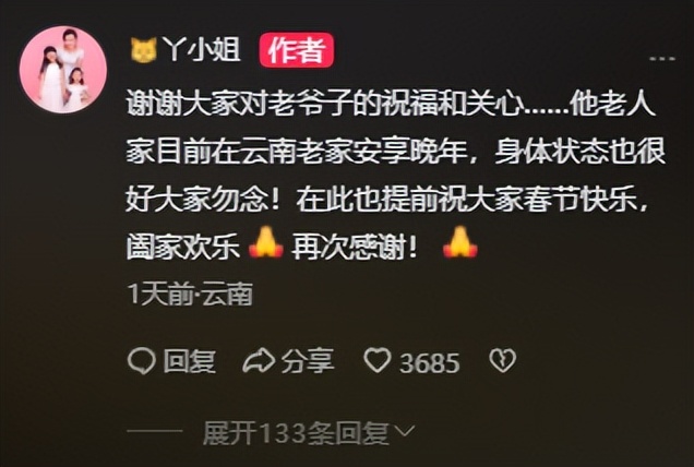 她没提这一年里多少个深夜独自流泪,也没说第一次爬上梯子换灯泡时的恐惧,只轻描淡写地说 “日子总要往前过,不能让你放心不下”。评论区里,高明的老伴特意留言感谢网友关心,透露老两口如今在云南安享晚年,身体状况稳定,让大家不必惦记。