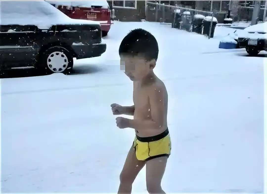 2012年1月31日,纽约街头,寒风像刀子一样刮过,一个四岁的孩子,光着上身,只穿条黄短裤,小脚踩在厚厚的积雪上,在厚厚的积雪中踉跄奔跑。面对这可怜的一幕,小孩的父亲却在一边不断地催促着小孩"快跑!不要停!!"