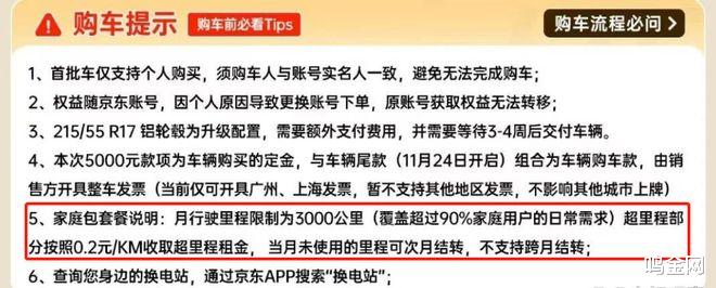 第二,租电方案隐藏关键条款,之前只说月租费用399块。交车后才知道还有“每月限行3000公里”的限制,超额按0.2元/公里收费。大家不是不能理解3000公里的要求,普通人一天100公里绝对够用了,目的大概率是避免有人去搞营运薅羊毛。可这事为何不能提前说清楚,大家反感的是京东先斩后奏不尊重车主的态度。