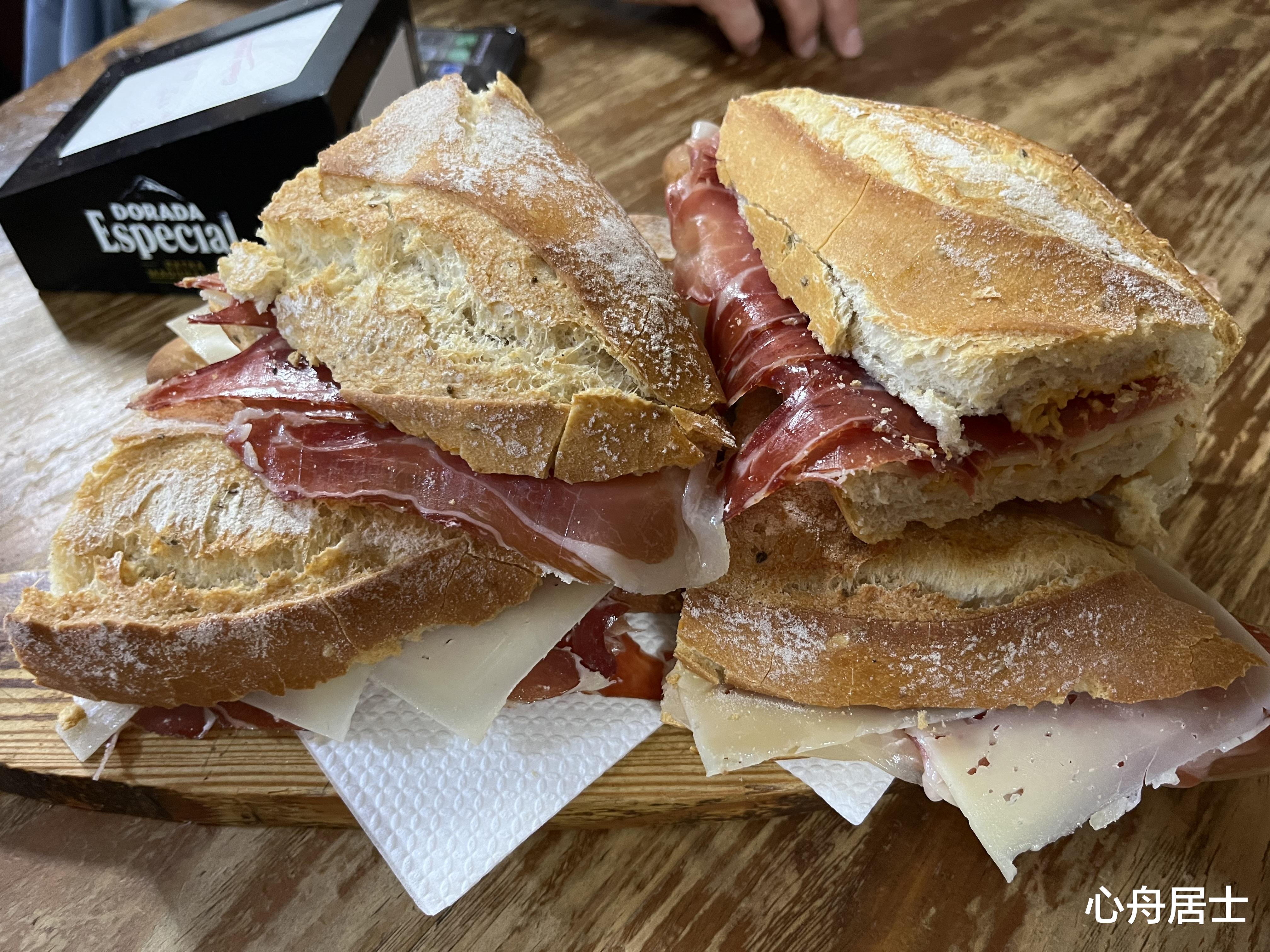 这天,我是真正感受到了西班牙人的热情。我们坐的飞机是在南部机场降落的,市中心位于北部。朋友知道我们在飞机上没吃东西,特地准备了三明治和水果,说是让我们垫垫肚子。从南到北,开车个把小时,午饭时间可能有点迟。我还以为真的会很晚吃午餐,狼吞虎咽了一个三明治。不曾想到市中心,同他爸妈和哥哥会合之后,马上给我们每人点了一杯咖啡,又要了一份夹火腿的面包。吃完之后,步行去同另外一个哥哥会合。见面之后,又找了一个咖啡馆,给每人要了一瓶啤酒,还要点吃的,我们坚决拒绝了。