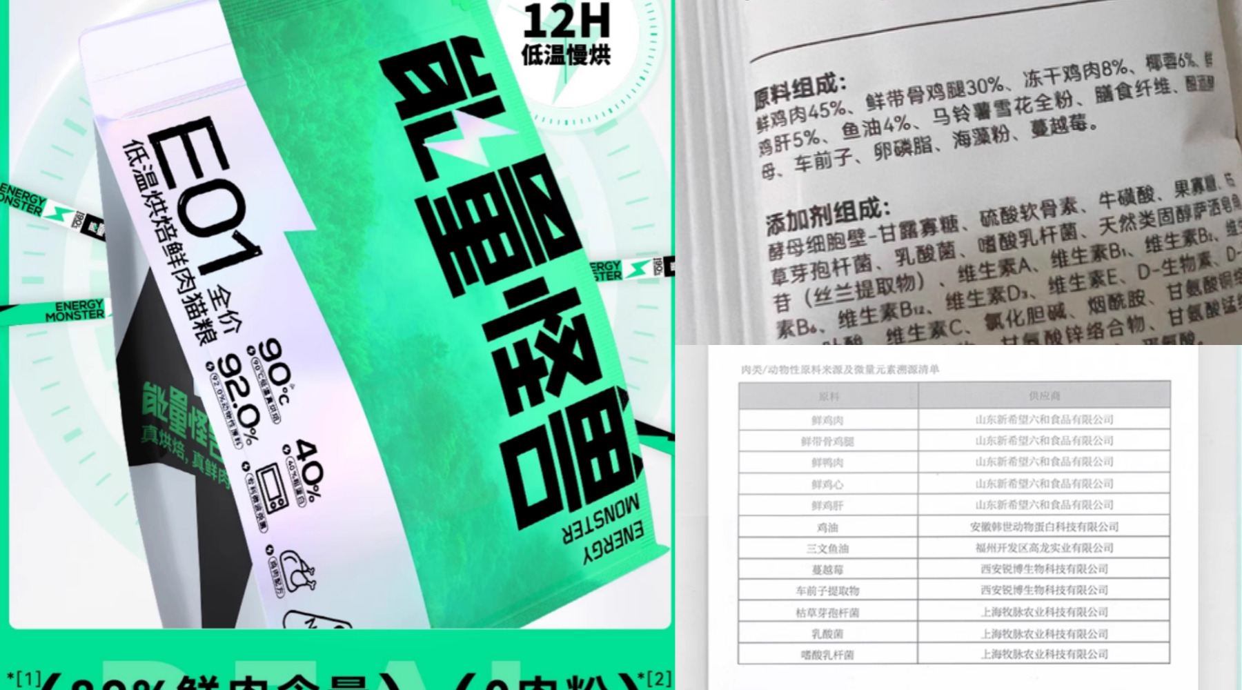 能量怪兽的原料标注还算清晰,鲜鸡肉、带骨鸡腿等占比不低,部分肉源能溯源到山东新希望六和,配方无谷物,碳水用马铃薯雪花全粉,安全性尚可。能量怪兽猫粮怎么样?它是真诚宠物生产的新兴国产烘焙粮,主打“多样鲜肉”配方,营养数据达到蛋白质40%、脂肪16%的标准,动物蛋白来源多样。但作为烘焙粮,它的定价在同营养水平里偏高。