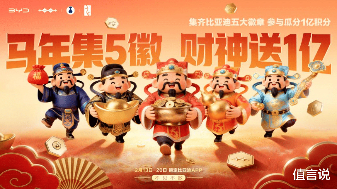 活动时间:2月13日至20日,只要你登录比亚迪APP,除了品牌车主可以自动获得相应徽章外,还可以直接获得20次抽卡机会,除此之外完成趣味问答、分享活动也可以获得抽卡机会,只要集齐王朝、海洋、方程豹、腾势、仰望五大徽章,就可以合成「比亚迪集团大徽章」瓜分高达1亿积分。
