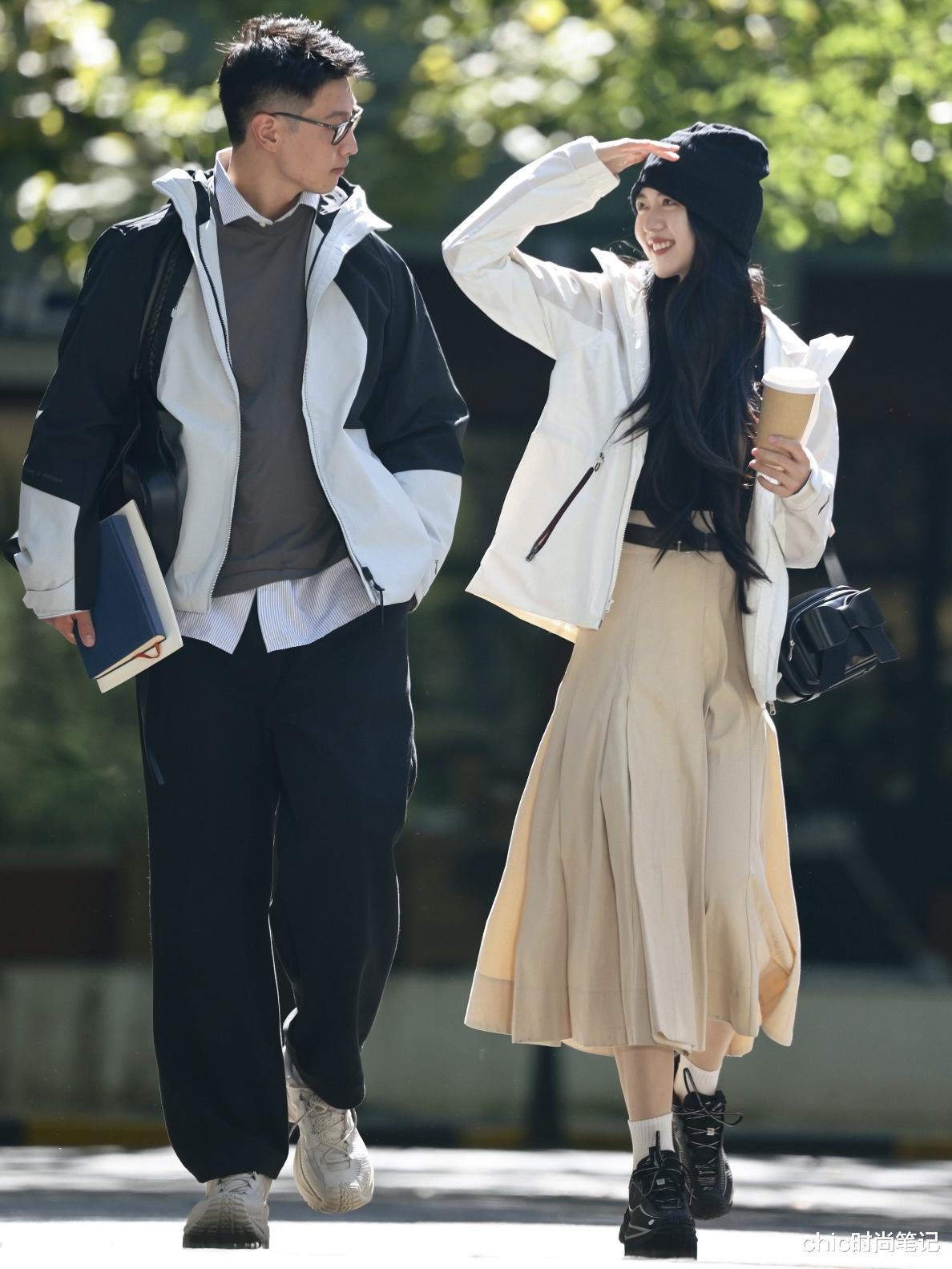 冲锋衣保暖又时髦,不同的色系和设计也能作为情侣装的搭配。男生内搭衬衫+针织衫,女生搭配高领毛衣和百褶长裙,两者减龄而活力,很有青春感。