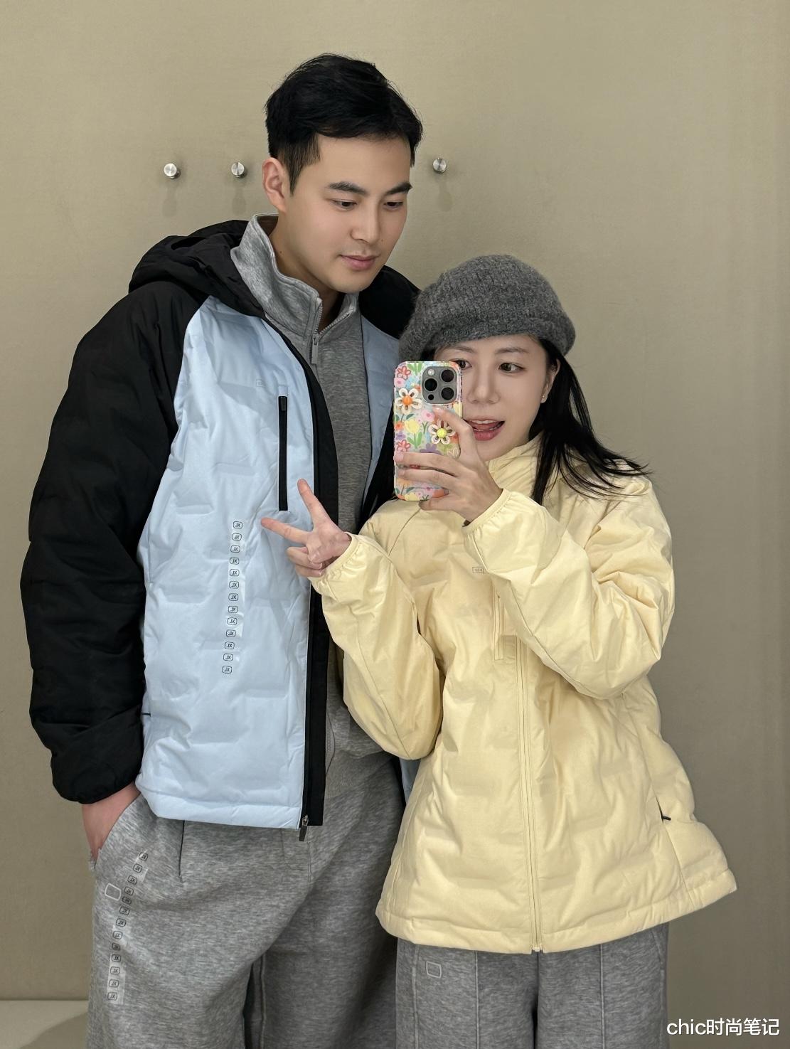 通过明显的色彩对比来当做情侣穿搭去看电影,也是非常的应景,没有繁复的设计和点缀,简单而清爽的冬日羽绒服穿搭就完成了。