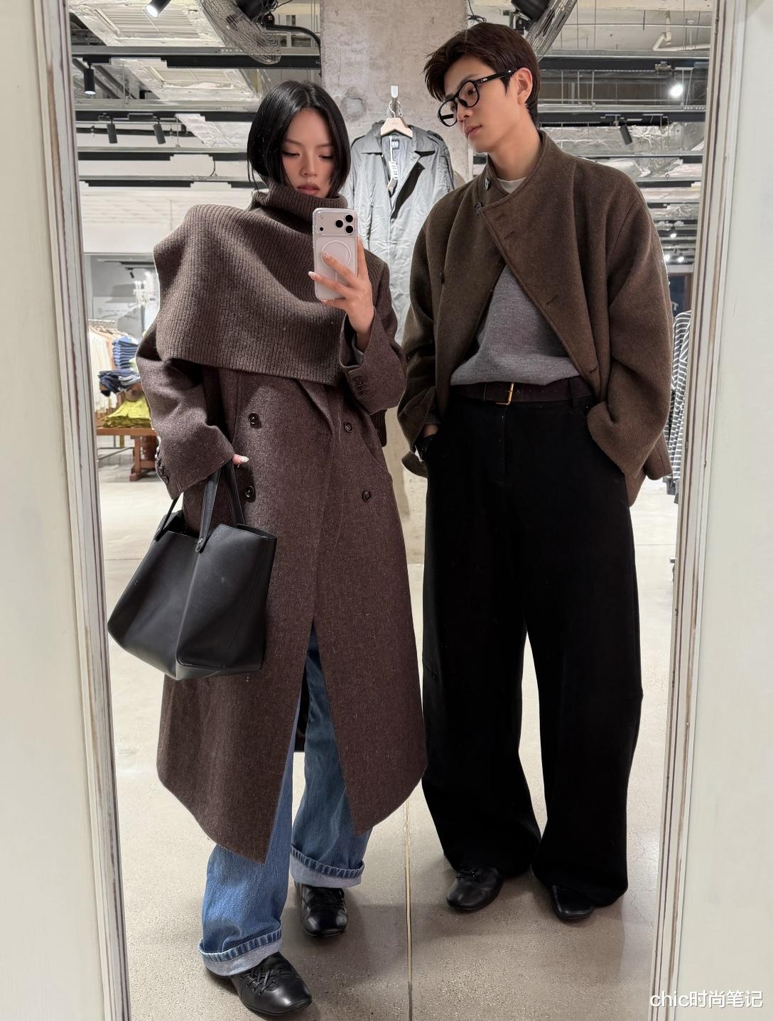 深灰色呢大衣自带设计感,领口处做了围巾披肩样式,下身搭配的是牛仔裤和小皮鞋,松弛而精致的女主,男生则用黑灰棕三色去做叠穿设计,层次与细节并存。