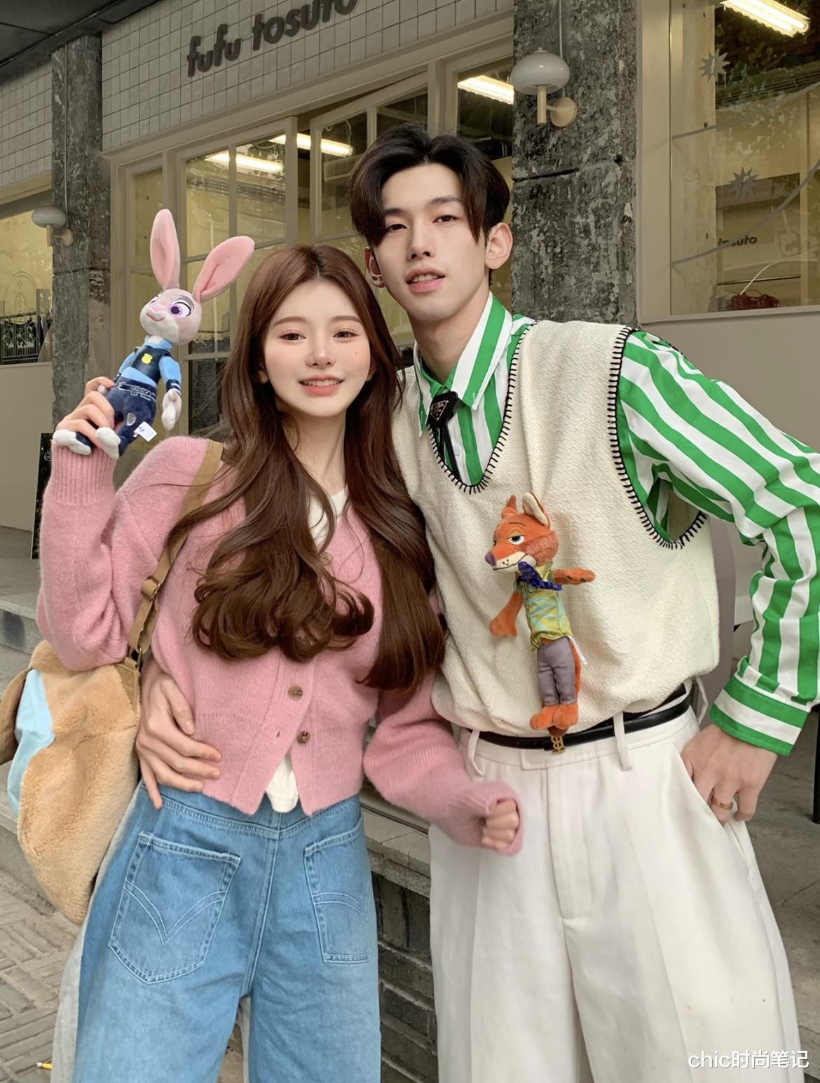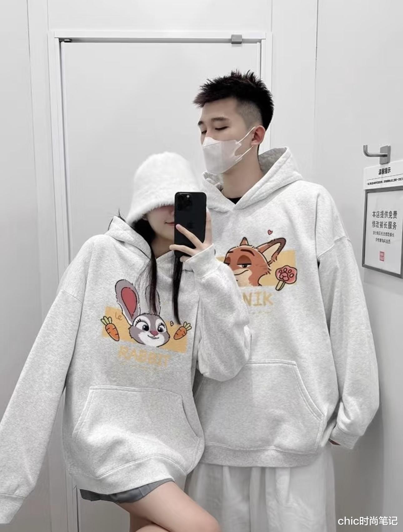 卫衣是秋冬必备减龄单品,一般都是男女同款,情侣装卫衣上的尼克、朱迪图案是恰到好处,与电影融为一体,俏皮又亲昵。