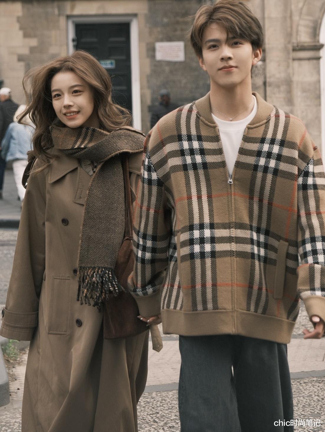 棕色和卡其色是秋冬必备色系,女生的棕色厚款风衣自带故事感,搭配羊绒围巾,复古穿搭get,男生选择与女生同色系穿搭,棕色格纹毛衣外套自带英伦风,加以白色打底衫,干净且清爽。