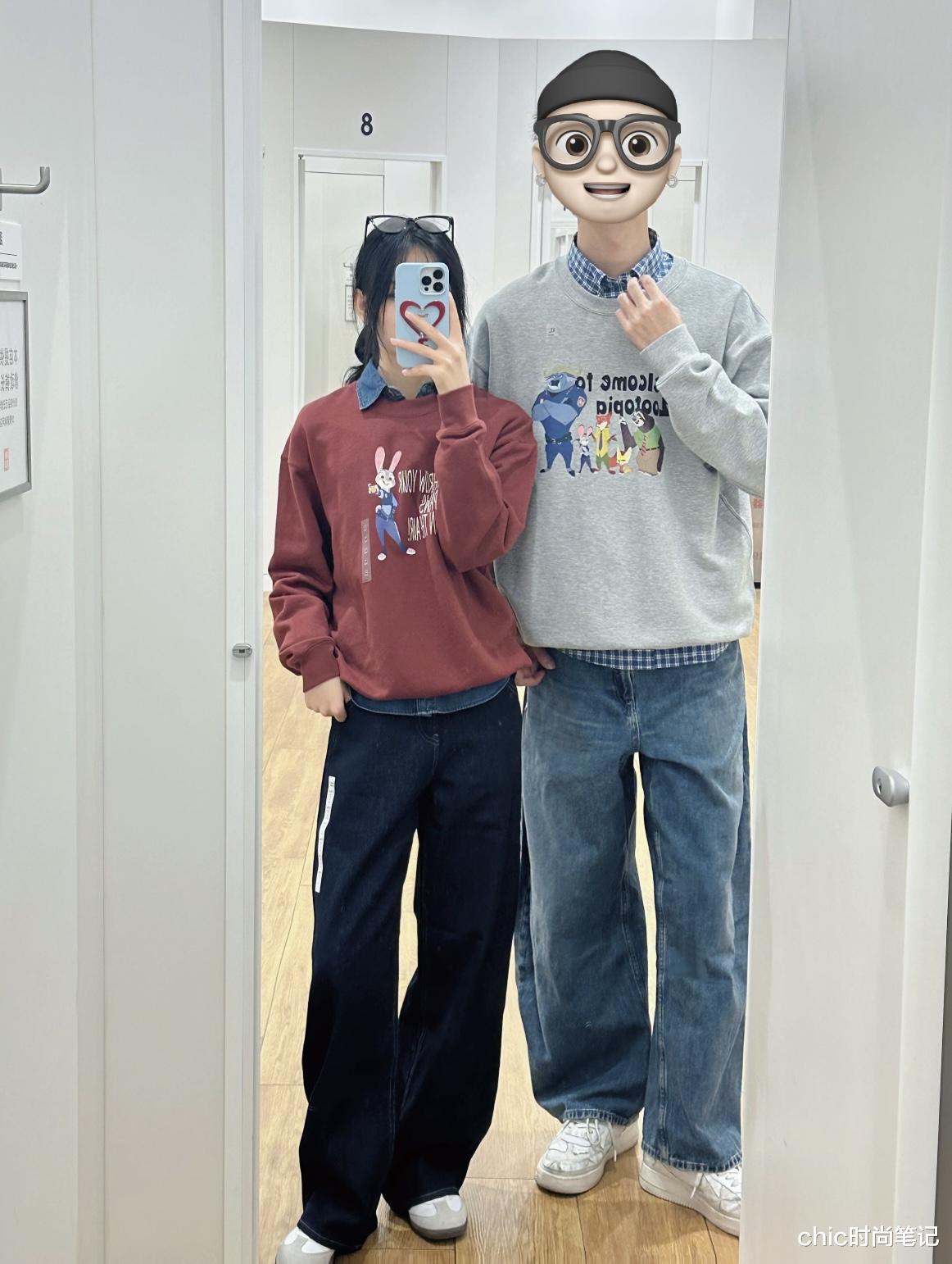 圆领卫衣是疯狂动物城的联名款,内搭格纹衬衫,用颜色来区分男女款,酒红色的卫衣和浅灰色的卫衣相得益彰,作为情侣装超搭配!