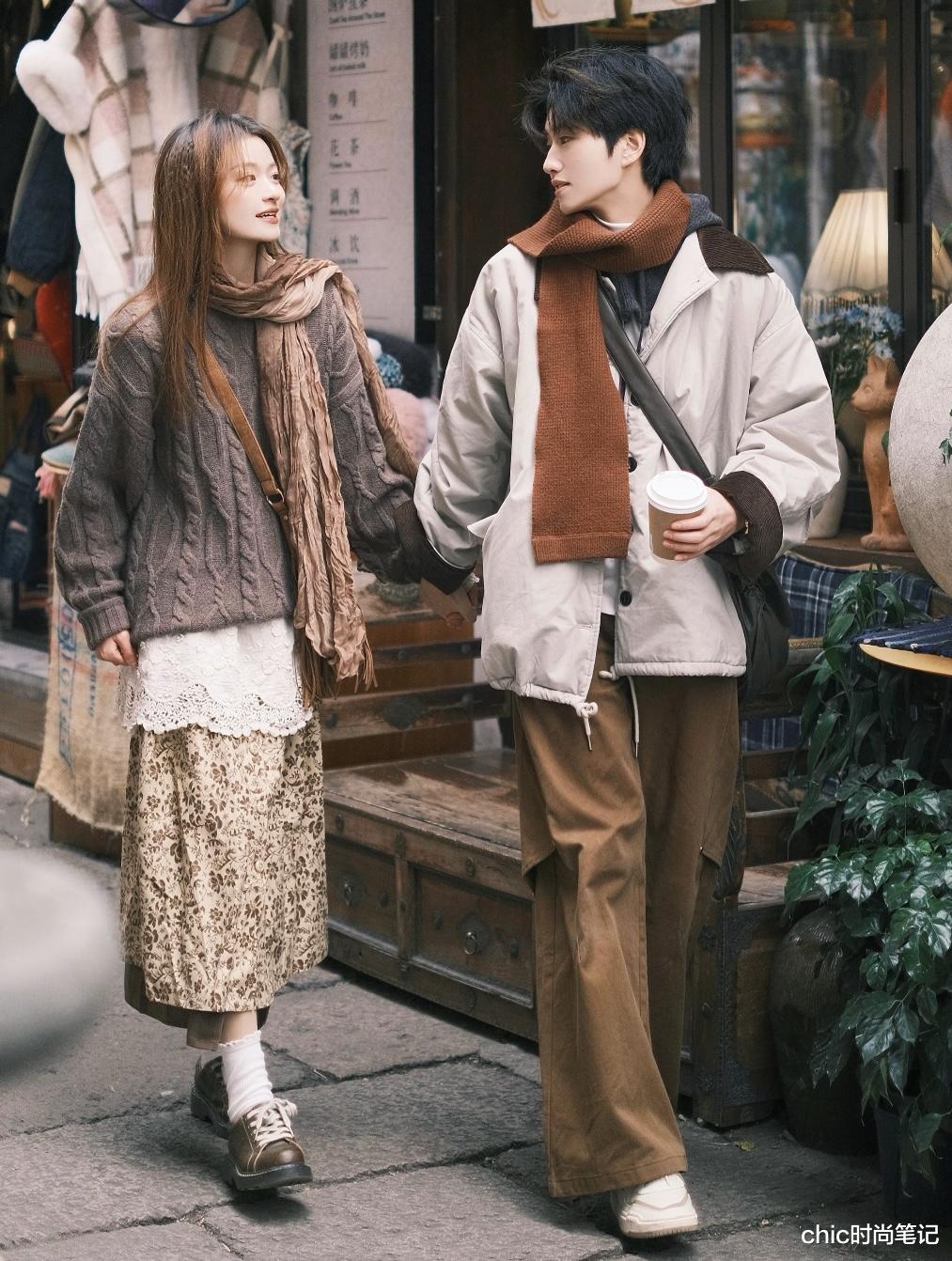 秋冬季节一般以深色系或者大地色系为主。女生:灰色毛衣+碎花卡其色半身裙+棕色围巾+棕色包包,男生:米白色拼接棕色冲锋衣外套+棕色休闲长裤+棕色围巾+黑色包包,两人的穿搭都是简约的大地色系,轻松打造复古时髦穿搭。