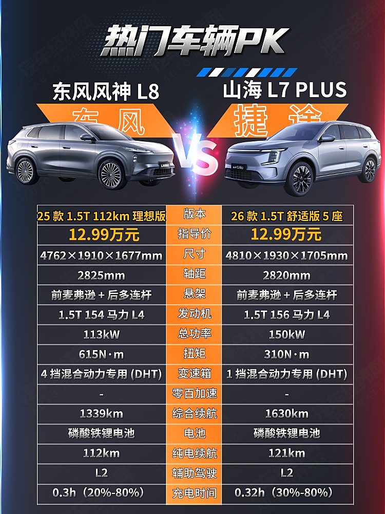 东风风神L8 2025款112km理想版售价为12.99万元,捷途山海L7 PLUS 2026款121km舒适版5座售价为12.99万元,两款车售价一致,均以性价比为卖点,主要针对家庭用户,那么哪一款车更加值得入手呢?