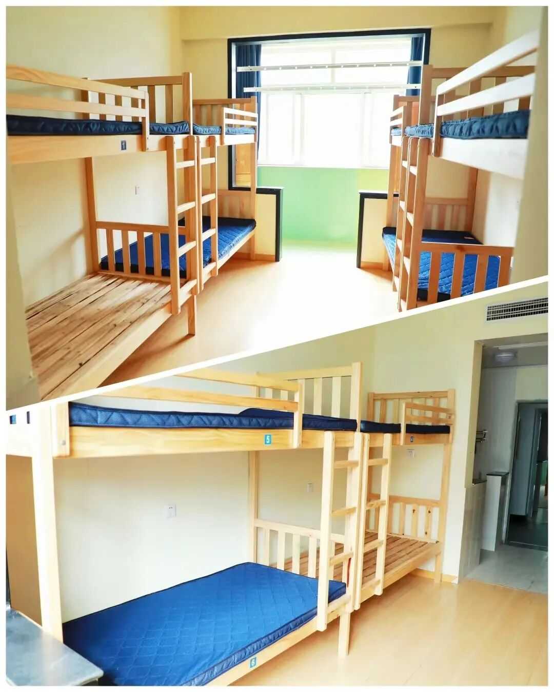 4-6 人一间上下铺,床铺和桌柜分置两侧,休息、学习互不打扰;