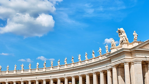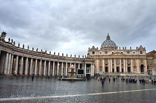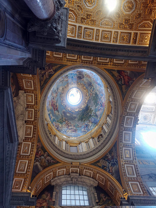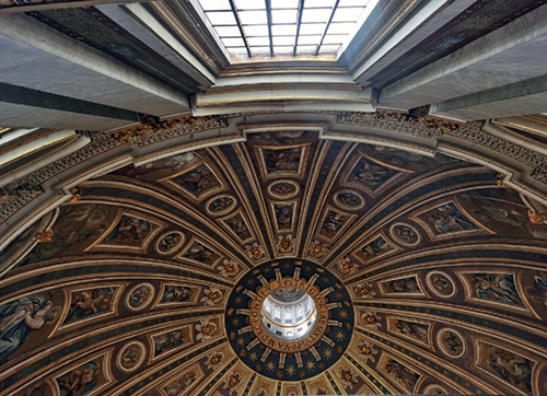 梵蒂冈大教堂并不像科隆大教堂那样高耸入云,但气势宏伟,教堂前有极广阔的广场,正面由40根巨柱排成弧形,屋顶站着40座雕像,营造出一种“高山仰止,景行行止”的气氛。进得教堂里面,空间极宽广,人显得很渺小,衬托出上苍的凛然。天穹照例是壁画,立柱旁照例是雕塑,蕴含着无数的故事,可惜我们一片茫然,只好欣赏它的雕塑艺术。