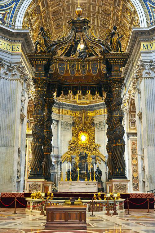 教堂内中央有一座极高大的铜亭,怕有三四层楼高,而铜亭离教堂的穹顶还远得很,足见穹顶之高。这座铜亭由四根巨柱撑起,而人还不到柱脚的一半高。有趣的是铜柱弯曲扭转呈螺旋状,满是密密层层的雕塑,有点儿像中国的盘龙金柱,但它却不是龙。