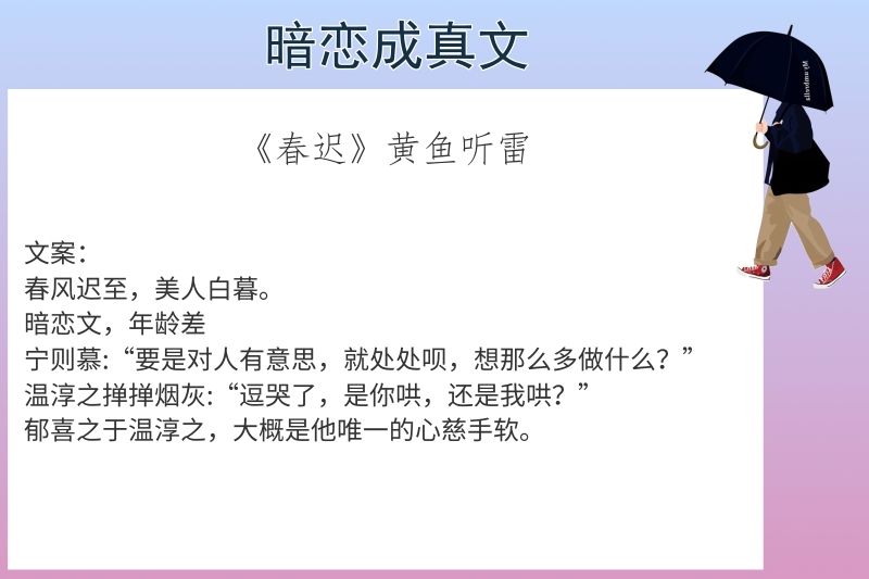 点评:这篇文集合了我喜欢的元素,暗恋+大叔文,女主暗恋好朋友的堂哥,但碍于年龄小和身份地位不敢表白,刚开始女主在男主眼里也只是妹妹一样的存在,毕竟女主确实小,他们认识的时候女主才上高中,男主有过挺多女伴,挺花心的一人,后面也慢慢被女主吸引,所以开始关注女主,有人打趣问他究竟喜欢女主什么,他也说不上来,或许爱意就是在相处中慢慢萌芽的,以至于他怕自己心性不定,怕对女主的感情只是新鲜感作祟,所以找了跟女主长得像的女伴,后面两人确定心意后甜甜甜,文末有点儿小虐,主要虐男主,看的很爽!