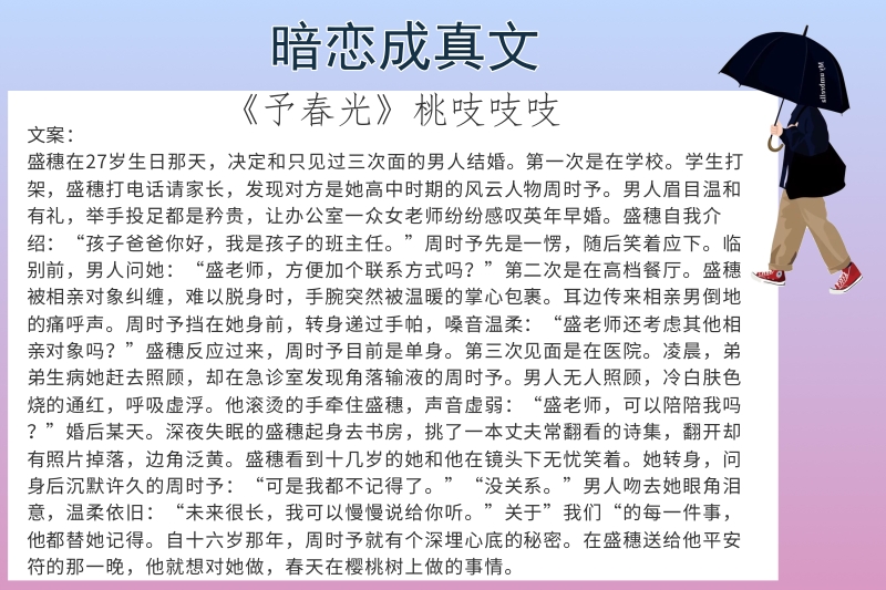 点评:现言,男主暗恋女主七年,但是女主一直不知道,和男主也没啥交流。女主和前男友谈了很多年恋爱,感情很好,直到快要结婚了,男主也打算放下开始自己的生活了,前男友精神出轨了,然后女主很果断的分手了。男主知道了,立马去女主面前刷存在感,然后差不多过了一年,向女主表白,和女主领证,给女主安全感。然后女主慢慢喜欢上男主。