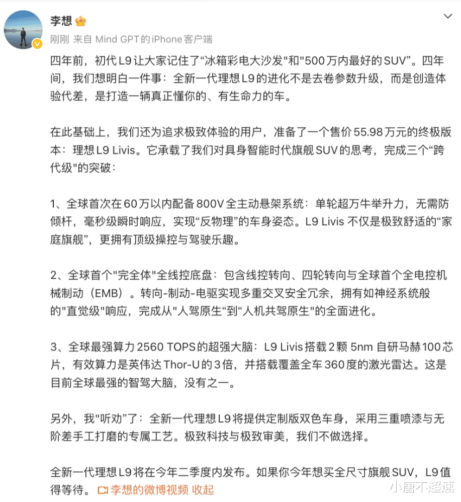 整体来看,全新理想L9 Livis版在智能化架构、底盘技术与车身工艺等方面进行了多项升级,但其具体动力参数及更多驾驶相关细节,仍有待官方进一步公布。