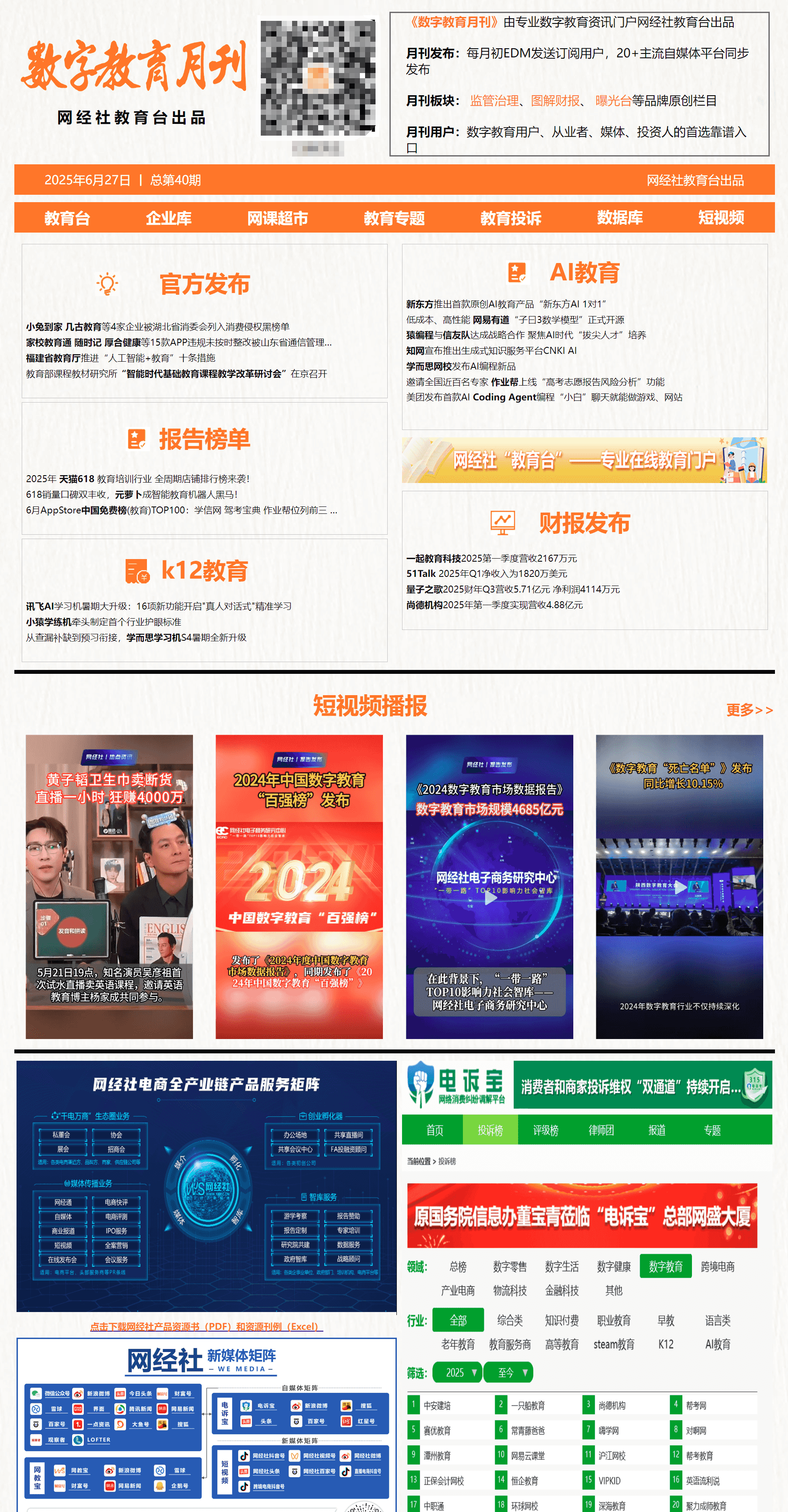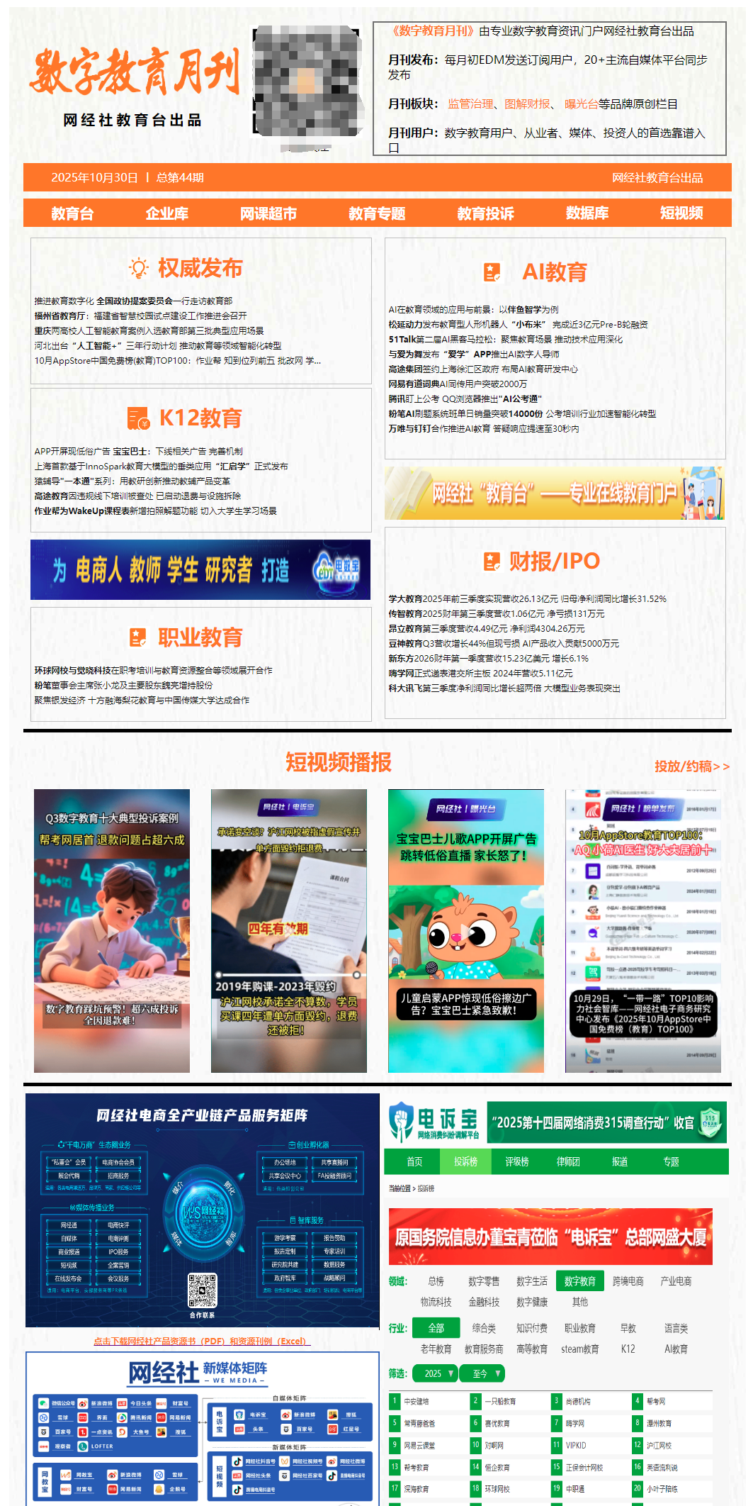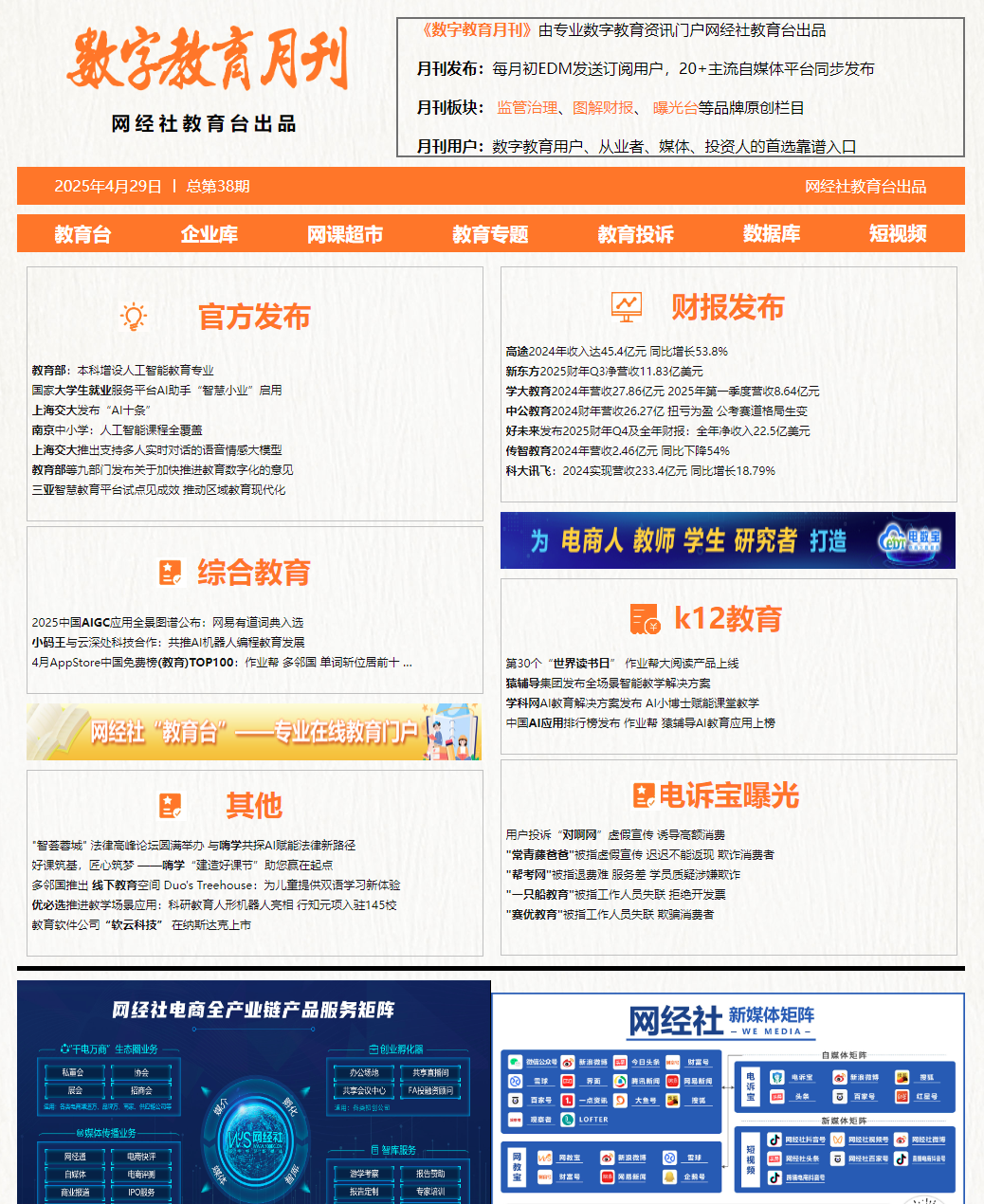 《数字教育月刊》由专业数字教育门户网经社教育台出品,面向数字教育从业者的精品内容产品,每月以EDM方式精准发送平台注册高端用户,并在线上长期专题集中展示、备查。