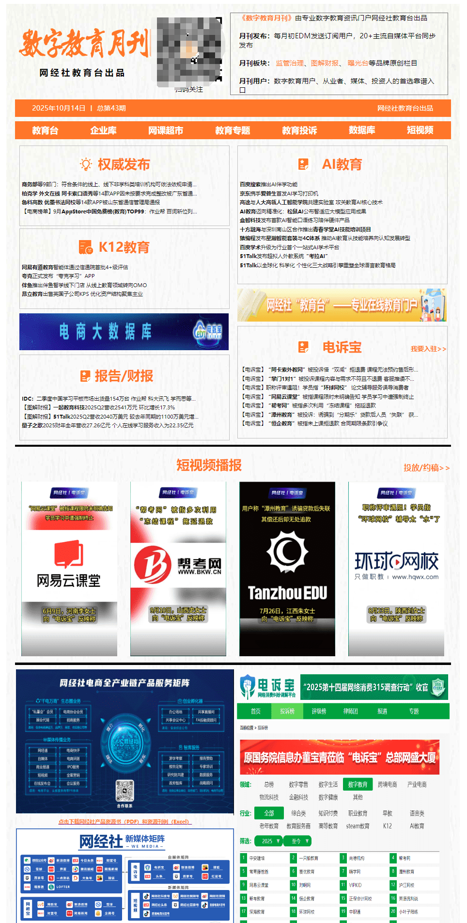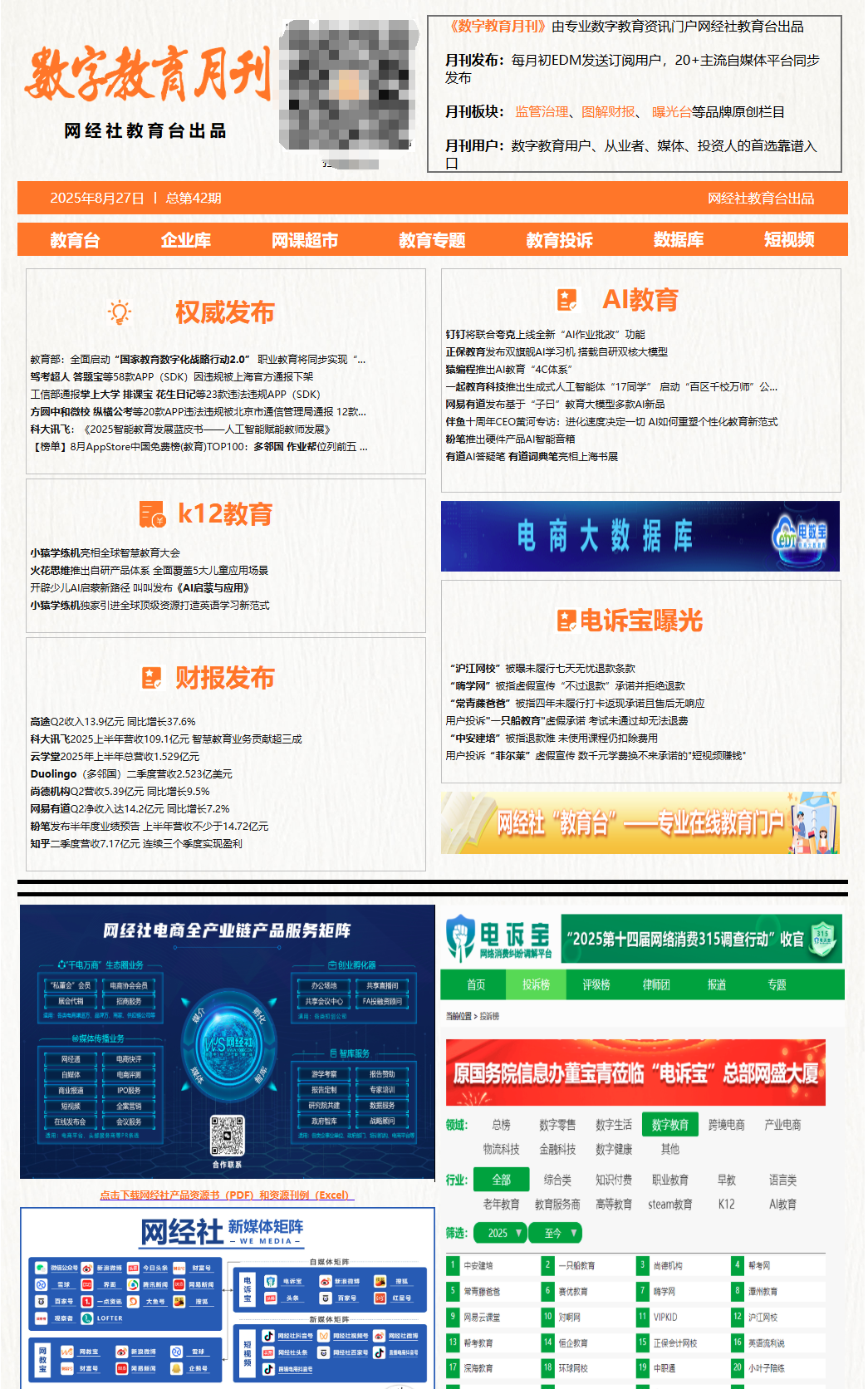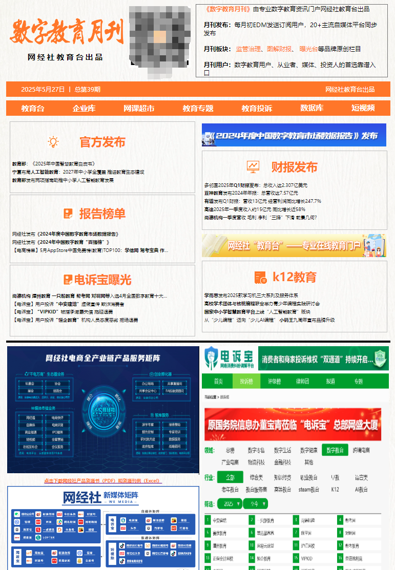 《数字教育月刊》由专业数字教育门户网经社教育台出品,面向数字教育从业者的精品内容产品,每月以EDM方式精准发送平台注册高端用户,并在线上长期专题集中展示、备查。