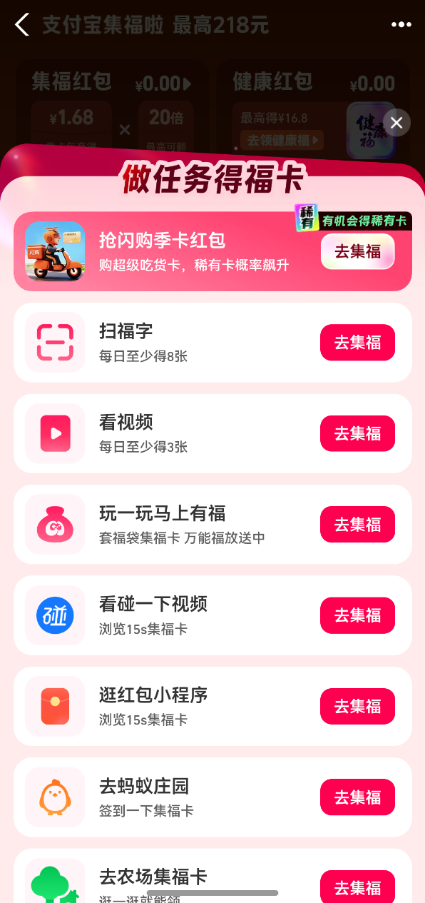 分享几个实测好用的集福姿势:日常扫福字、扫马年元素,福卡就来了;看几秒钟视频,又是一张;逛一逛农场、去蚂蚁庄园签个到、玩玩“马上有福”躺着也能得福卡;甚至逛一圈红包小程序,或者在便利店用碰一碰买瓶水,福卡也能水灵灵地到手。