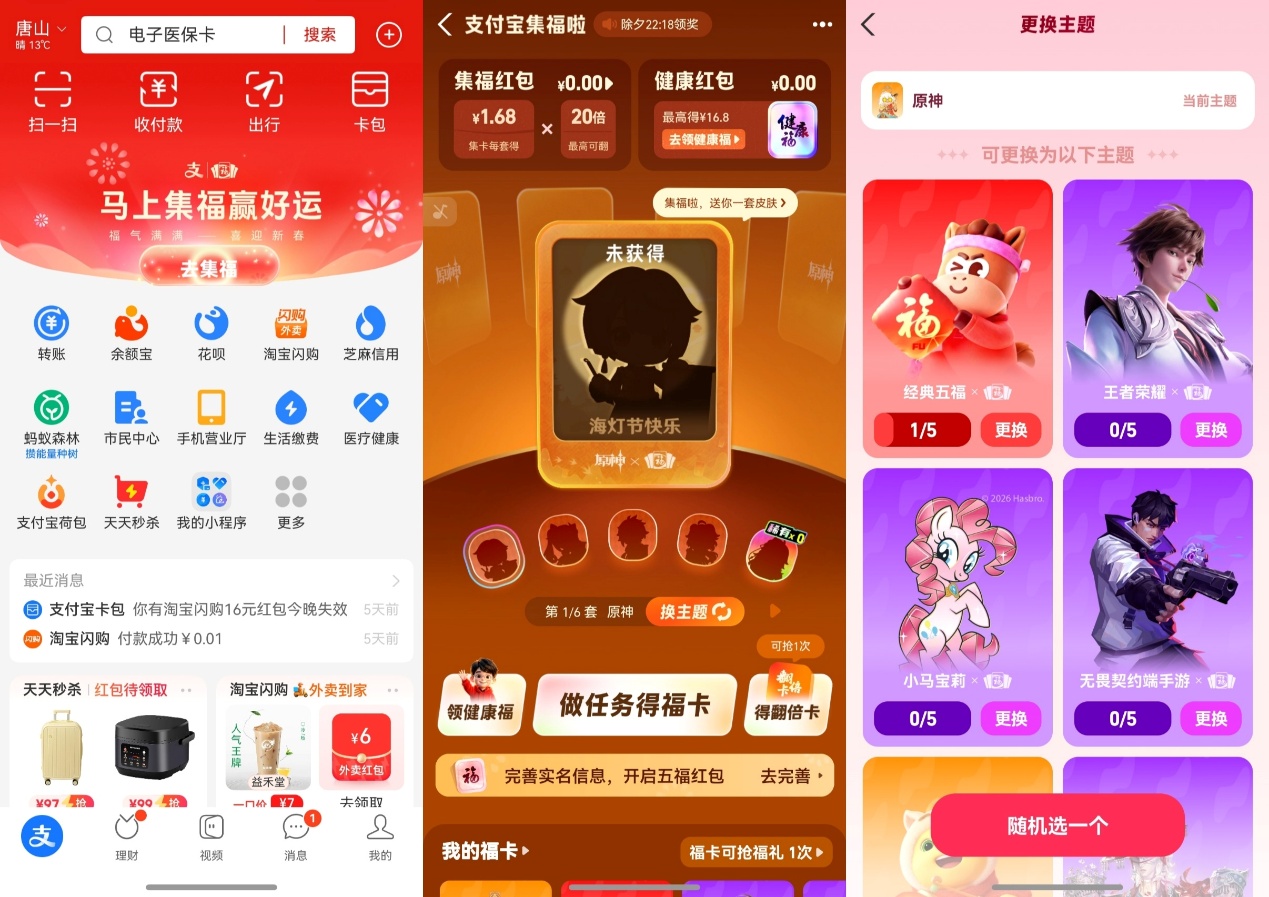 这次更新最重磅的,当然是集福玩法大升级。除了经典五福,鸿蒙版支付宝一口气上线了19种主题福卡!小马宝莉、王者荣耀、原神、乡村爱情……总有一款戳中你。我选的原神主题,每集一张福卡就能去"福气集市"抢福礼,集齐5张就能解锁现金红包!过年嘛,图个乐呵。让我看看你都集到啥卡了?