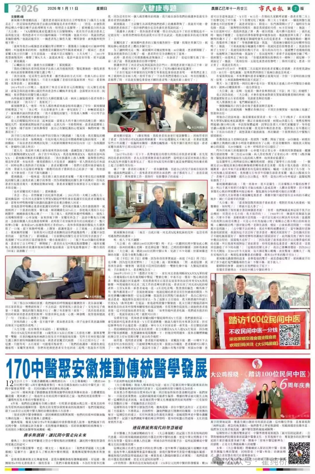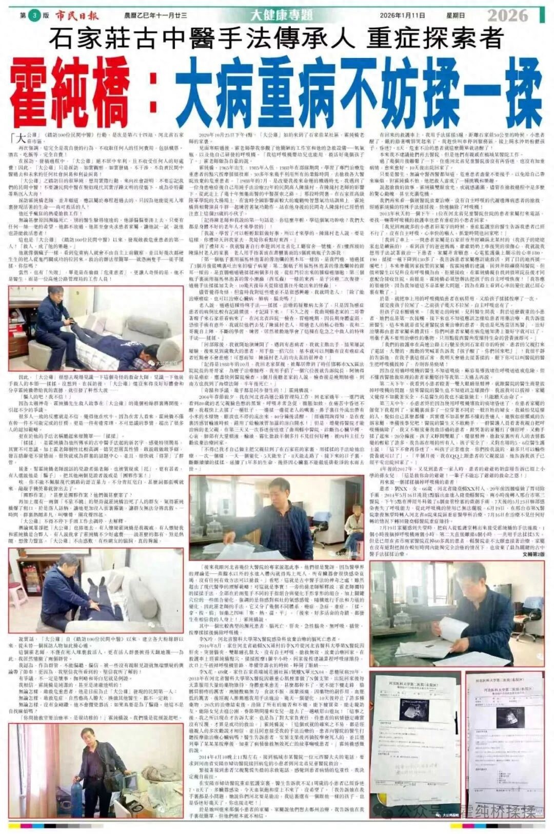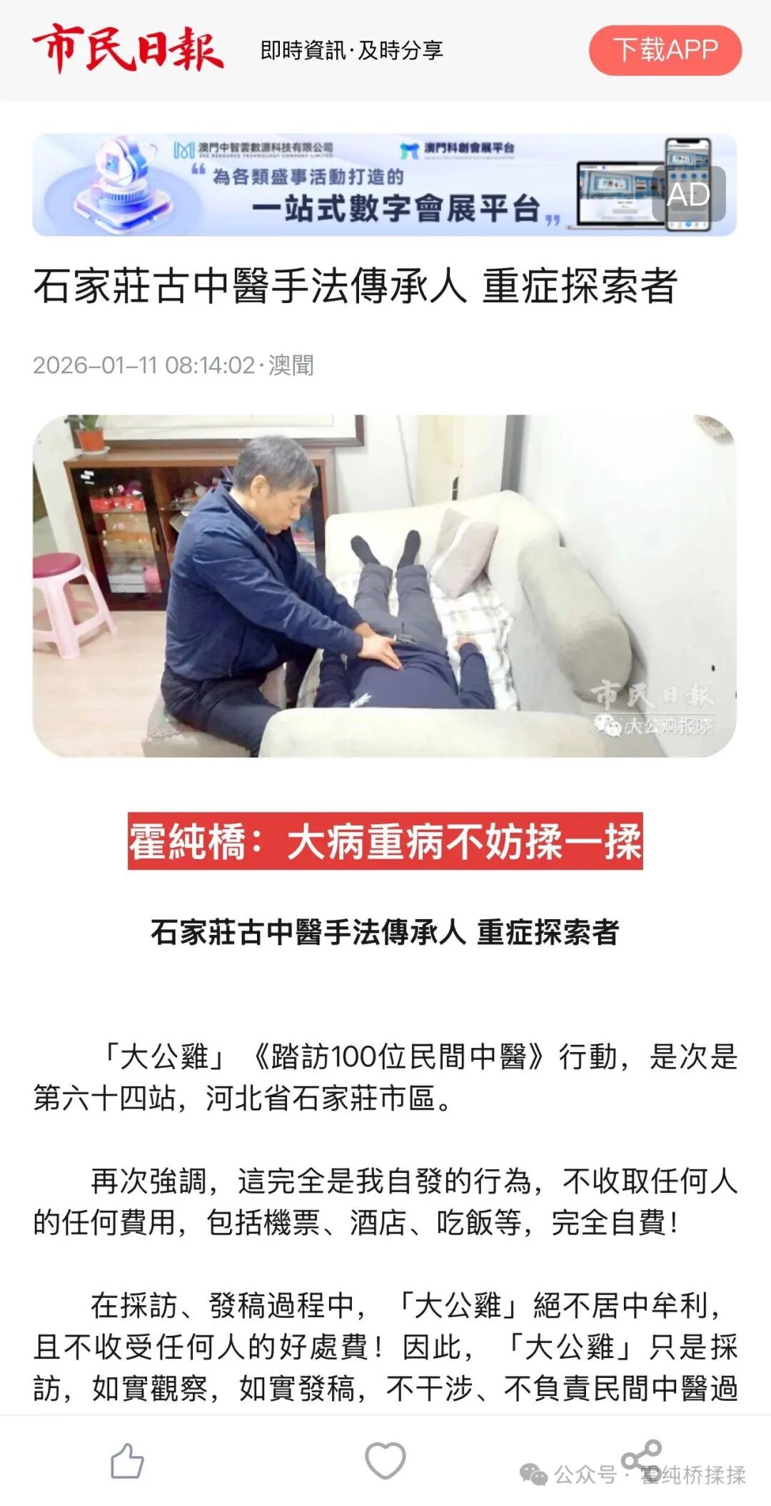 2025年中秋节前夕,澳门市民日报负责人謝德華,在一位热心市民的推荐下来到了石家庄,他要亲自验证大公鸡杨东报道的霍纯桥先生的真实性。真金不怕火炼,几天过后,他专门从珠海寄过来几份点心,“大公鸡杨东的大公鸡报晓果不其然,完全出乎我的意料,回去后我要用澳门市民日报整个篇幅替大公鸡发声,让广大澳门市民都知到内地的中医药发展情况”。2026年1月11日。大公鸡报道的第64篇文章,謝德華先生亲自验证的第一位民间中医,在澳门日报见报了 。