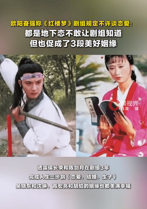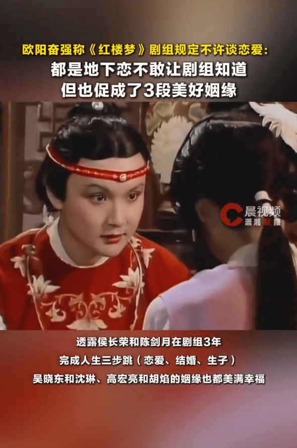 2月11日,87版《红楼梦》中贾宝玉的扮演者欧阳奋强在视频中透露,当年剧组有明确规定,禁止演员谈恋爱,大家只能偷偷发展感情,却也因此成就了三段美满姻缘。他表示,侯长荣与陈剑月在剧组三年便完成了相恋、成婚、生子的人生三部曲,吴晓东与沈琳、高宏亮与胡焰也都收获了幸福长久的婚姻。