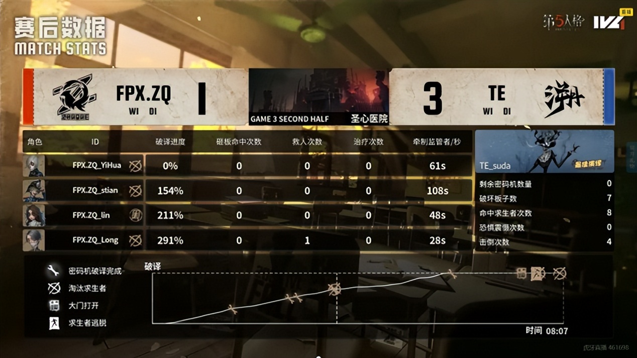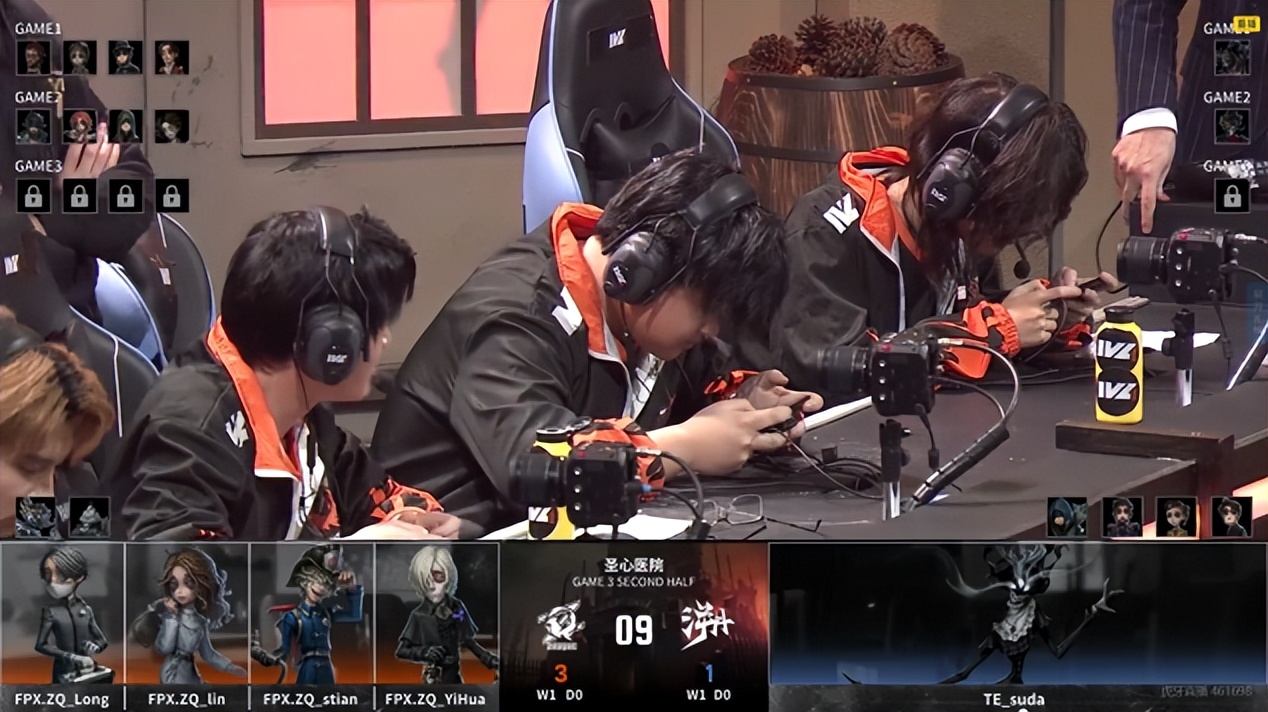 FPX.ZQ的求生者选择了入殓师、“心理学家”、守墓人、火灾调查员(BAN“喧嚣”、“记录员”);TE的监管者suda选择了时空之影。(BAN先知、冒险家、空军、幸运儿)