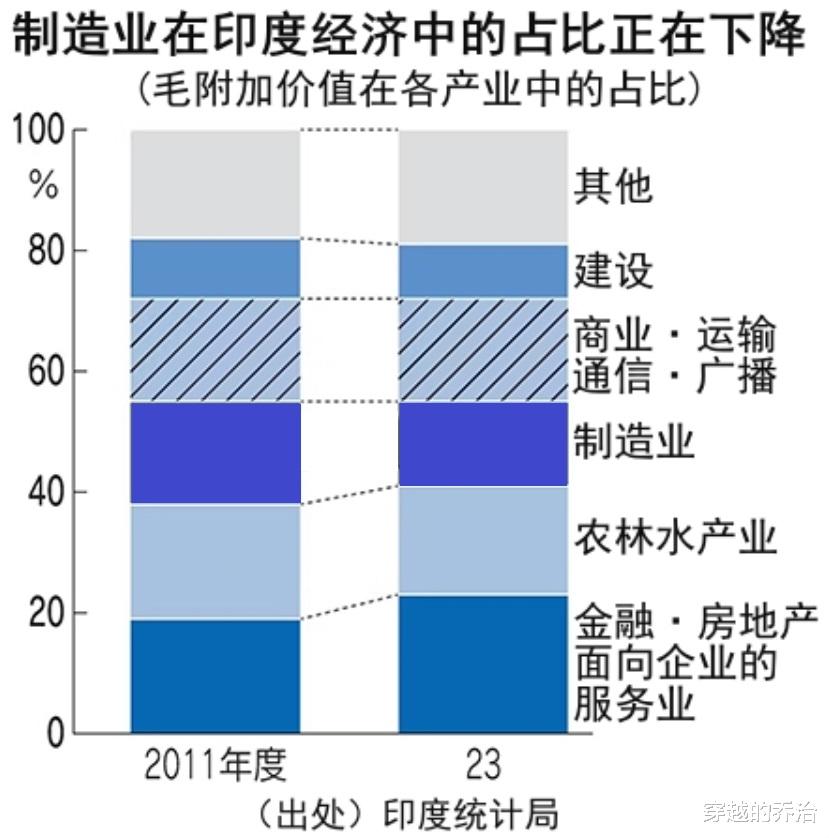 尽管印度2023年度国内生产总值(GDP)实际增长率达到8.2%,但驱动力来自于公共投资扩大而受益的建筑业,以及新冠后恢复的制造业。从事建筑业的人占印度就业人口的13%,制造业是12%,两大繁荣行业加在一起约25%。2023年印度46%的就业人口所从事的农林水产业仅增长了1.4%,12%的就业人口所从事的商业·旅游业增速是6.4%。因此印度就业人口的近6成,完全感觉不到经济快速增长。因此以政府和企业投资为主导,家庭经济缺乏,劳动力过剩问题并未得到解决,工资增长乏力。