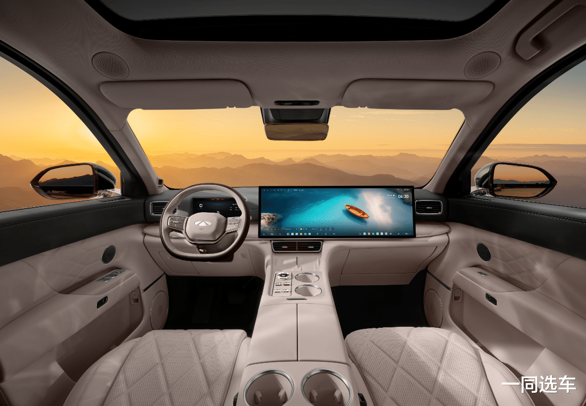 进入车内,风云T11提供碧玺黑、琥珀棕以及羊脂米三种配色方案,整体的设计紧随当下审美,前排配置了30英寸一体式中控副驾双联屏,车机芯片为高通8255,手车互联支持CarPlay、HiCar、CarLink。换挡为电子怀挡。