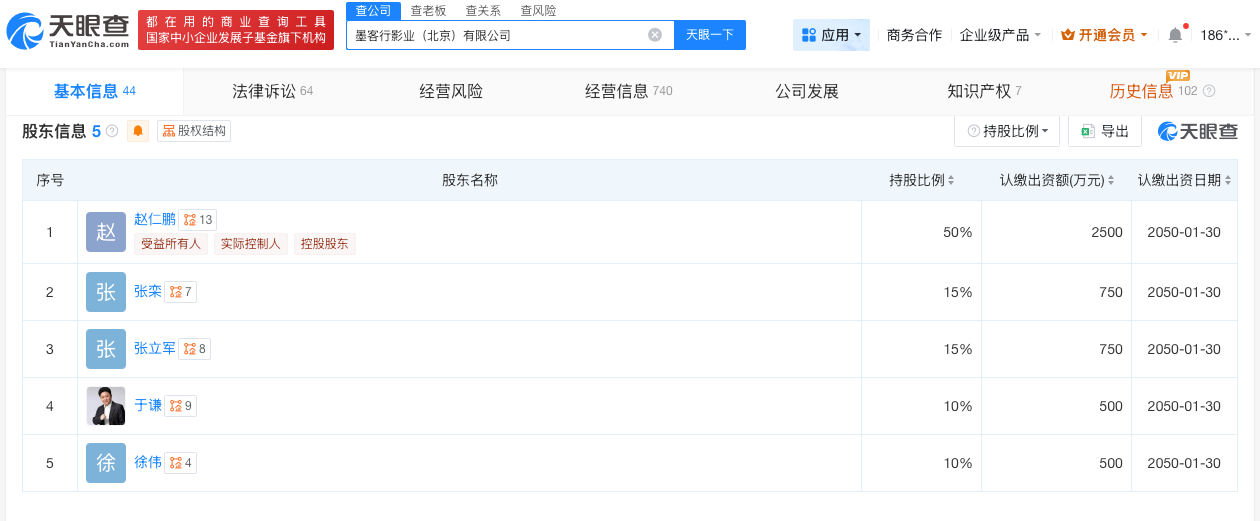 墨客行影业(北京)有限公司成立于2019年1月,法定代表人为赵仁鹏,注册资本5000万人民币,经营范围含电影摄制、组织文化艺术交流活动、影视策划等。股东信息显示,该公司由赵仁鹏、张栾、于谦等共同持股,其中于谦持股10%。