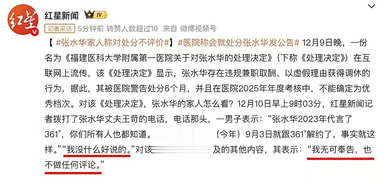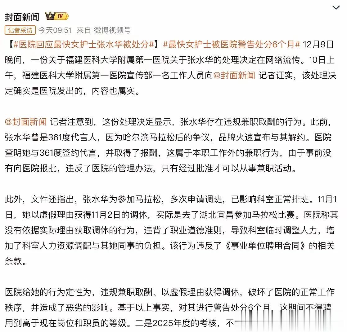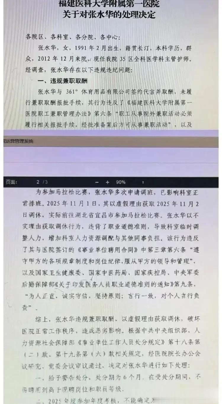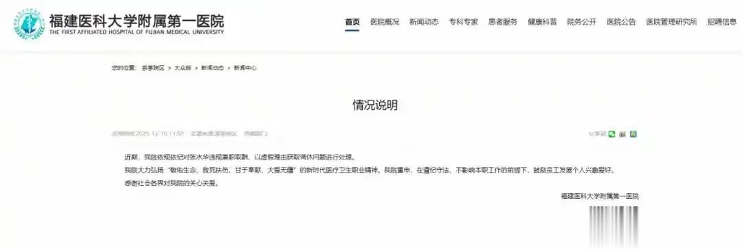 这次医院彻底撕破脸,12月10日,福建医科大学附属第一医院通报,依规依纪对张水华违规兼职取酬、以虚假理由获取调休问题进行处理。