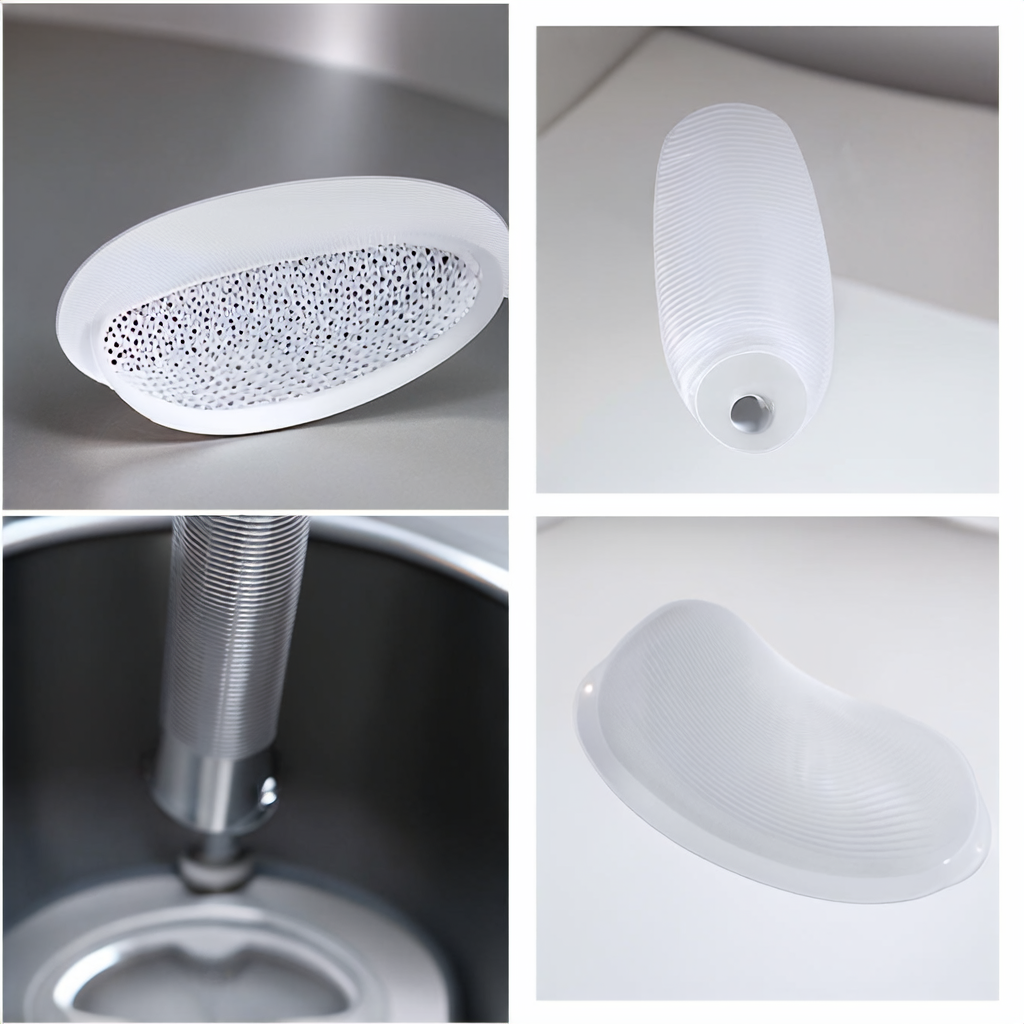 收到货后,发现它就是一片柔软的、伞状或花瓣状的硅胶垫,中间有细密的滤孔。安装简单到不可思议:只需要把老旧的滤网或盖子取下来,把这个硅胶滤网对准下水口放上去就行。由于其材质柔软且有弹性,它会自动贴合下水口边缘,形成密封。我用手按了按,确实严丝合缝,把水槽放满水再拔掉塞子,水能顺利流下,但硅胶垫会紧紧贴住口子,没有上浮。