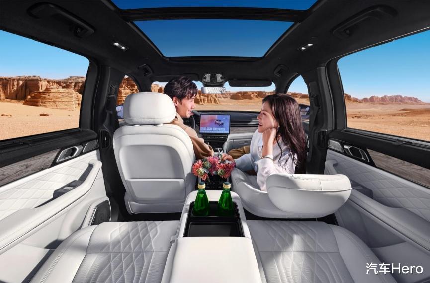 二排新增多功能中央扶手,放倒秒变商务四座行政座舱;二排小桌板,既是长途自驾的阅读桌和移动餐吧,又是商务出行的移动工作台。全车Nappa真皮覆盖,三档加热、通风和8点式背部按摩由前排独享进阶为四座同享,带来二排舒压放松的平权,搭配双层静音隐私玻璃和遮阳帘,能有效防晒、保护隐私;同时,副驾还新增280mm一体式4向电动腿托,可一键开启女王专享,舒适躺姿堪比航司头等舱。